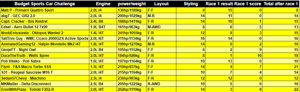 TCup also made some good suggestions on how to add further specificity, which would help even more (especially regulating power-to-weight, which is something real life race series do). But even if you don’t want to make the rules too restrictive, a specific definition or clarification of what the theme is, and what that means for a practical sense would also have helped. There’s a reason most forum competitions start with very long briefs; it’s all about communicating everything up front.