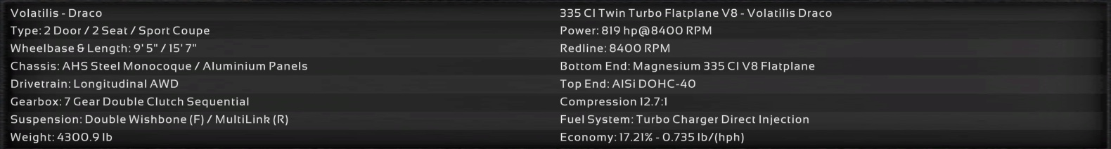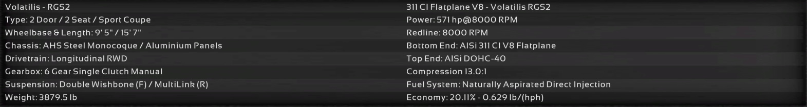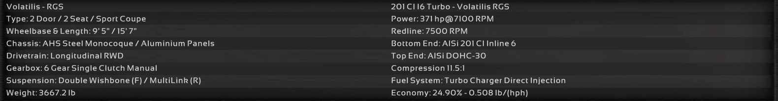 The trim we are showcasing here, the RGS3, comes with a 5.3 L Twin Turbo Flatplane V8 sending 695 HP to all 4 wheels with the help of a 7 speed double clutch sequential gearbox, electric limited slip differential, and a longitudinal AWD system. The Volatilis comes with sport tuned Double Wishbone Front/Multilink Rear suspension, and sport tuned disc brakes. This allows for the Volatilis to go from 0-62 MPH (0-100 KPH) in 2.9 seconds, achieve a top speed of 194.8 MPH (313.5 KPH), and clock a 1:16.1 on the Top Gear Test Track.
