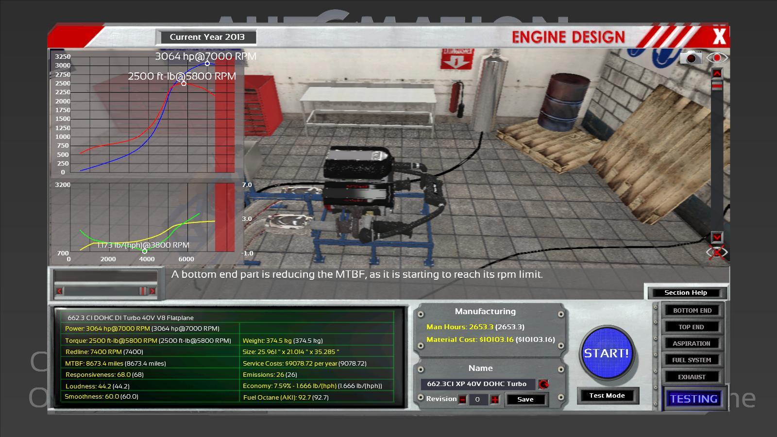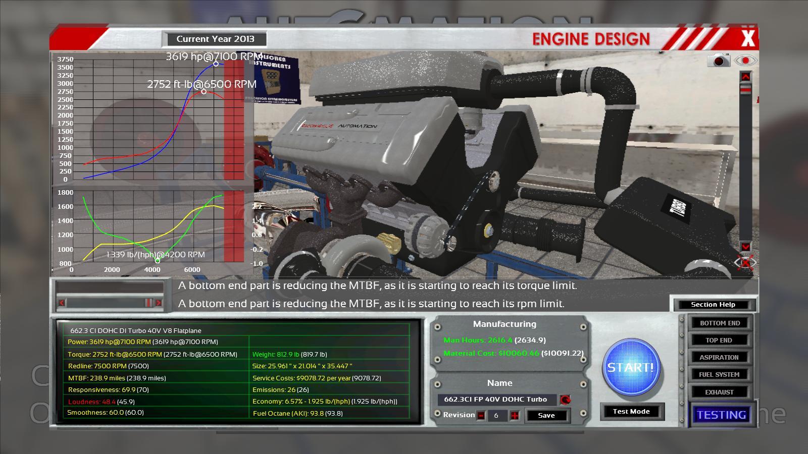 The engine is a 662.3 flat plane V8, 4.724 bore AND stroke…ultimate unleaded 95, and 7400 RPM limit. The power band currently cuts off at 7000, but can spin it up to 8100 and still hold up.
