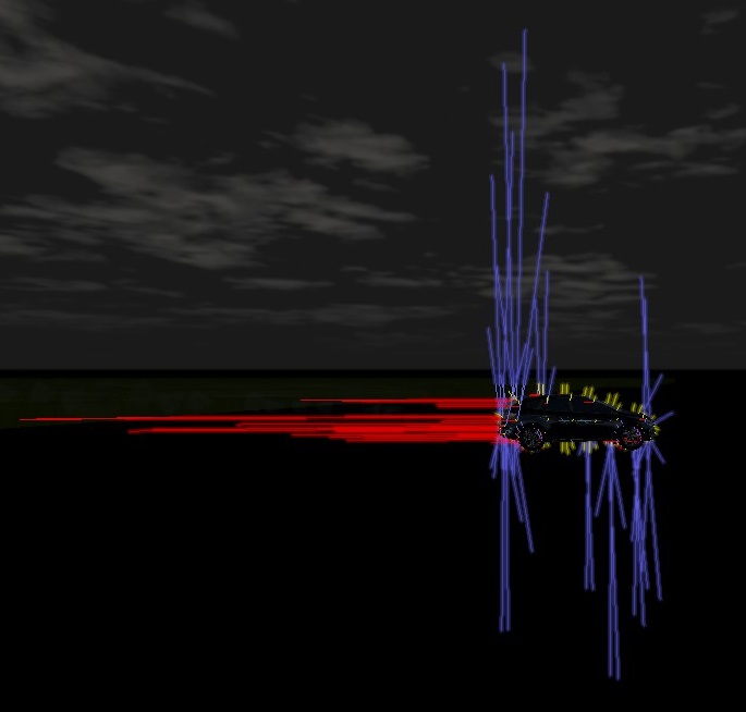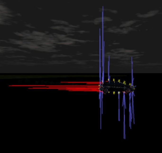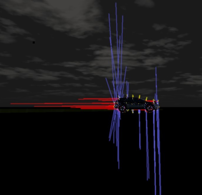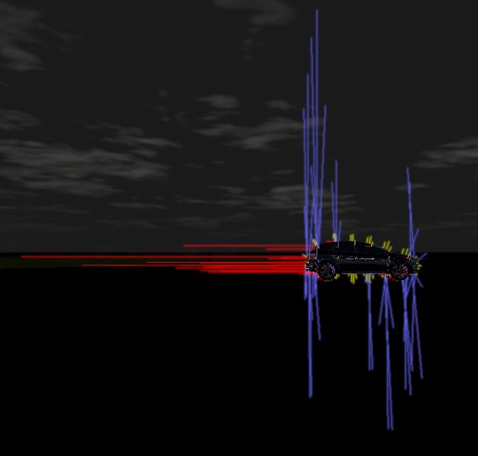 One of the debug options in BeamNG.drive is, after activating debug utilities in the general options, available under debug as aerodynamics (citation needed). This shows the COG, center of gravity, and COP, center of pressure (citation needed), as invisible points marked with red and blue text respectively, as well as red and blue lines of variable length indicative of drag (citation needed) and downforce / lift respectively. The blue lines, that have been shown to correlate with aerodynamic downforce and lift, are the main source of information for the following analysis. Note that ground textures obstruct viewing of the lower lines, which is why the cars are driven onto a part of the map without such obstructions.