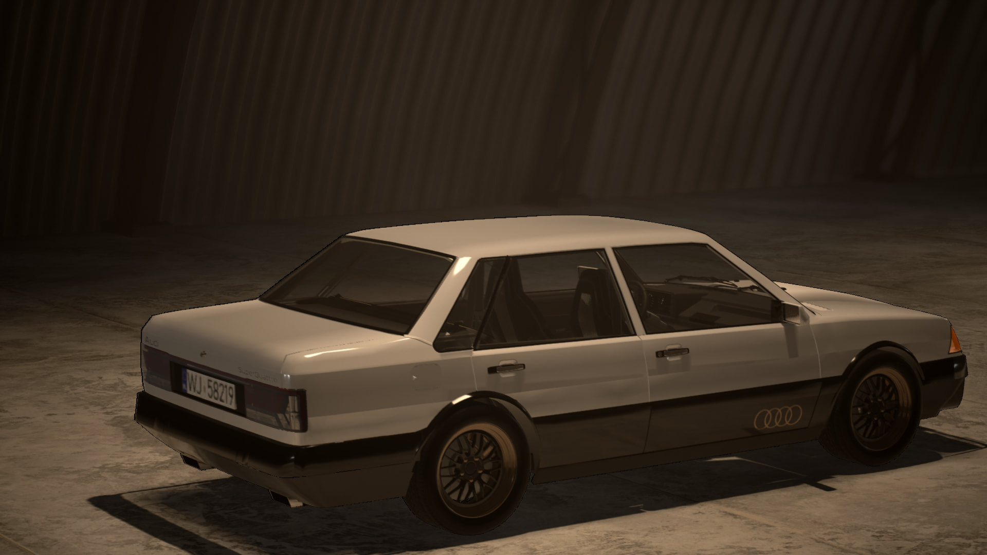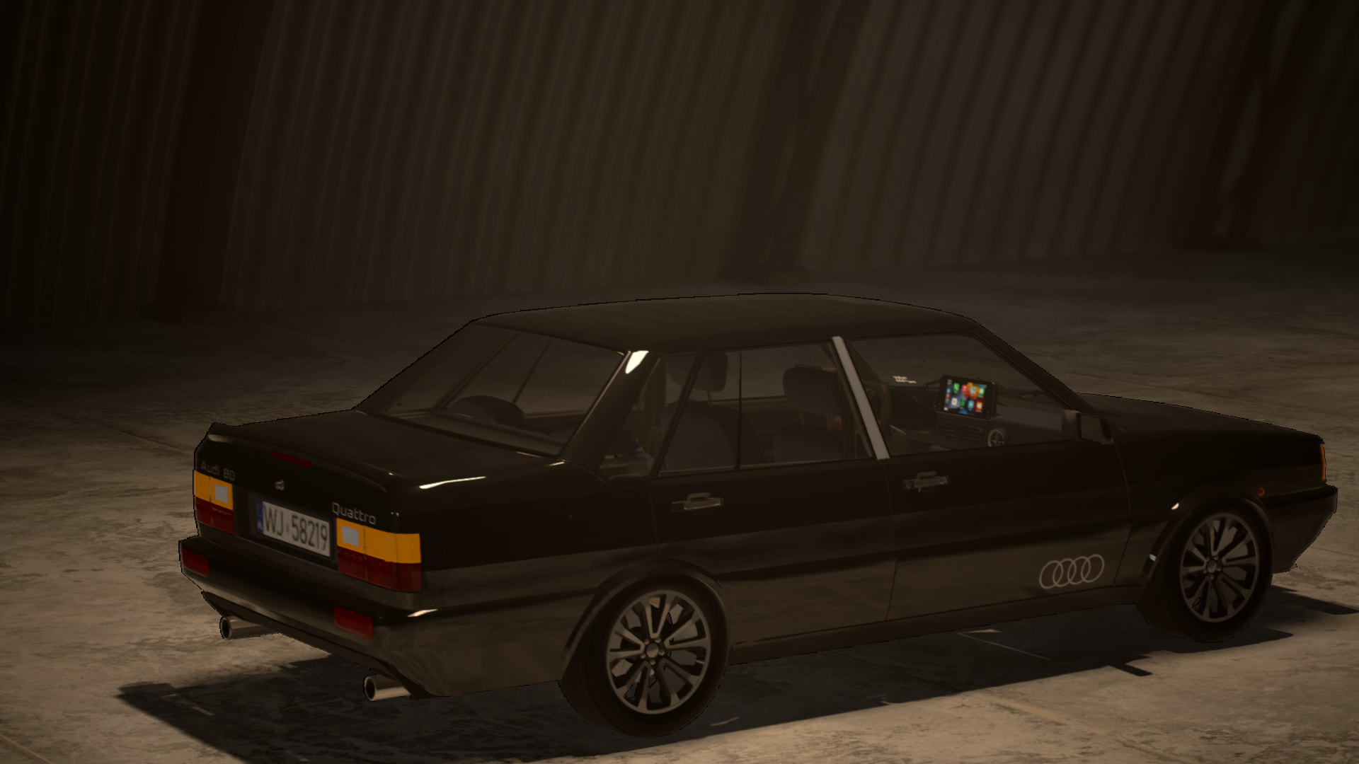 Out of all the cars, this one has the mildest upgrades aesthetically. It’s not ugly by any means, it is just that while the other cars had some more interesting customwork going on, this is more or less a black Audi with alloy wheels and a rear spoiler, for the better and the worse. Absolutely nothing wrong with that, and it gives some authenticity points, but is maybe a bit boring. But the overall choice of mods does not clash with the car in general (maybe the rear fog lights that TEB customs have added added are a bit on the large side, if one should complain).