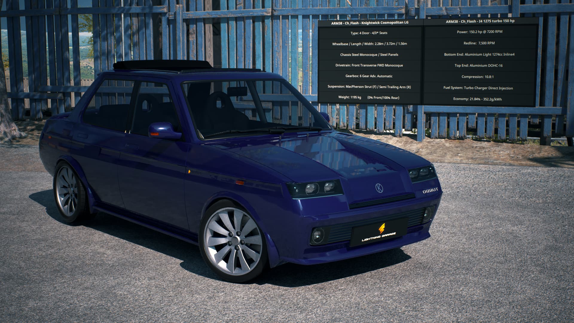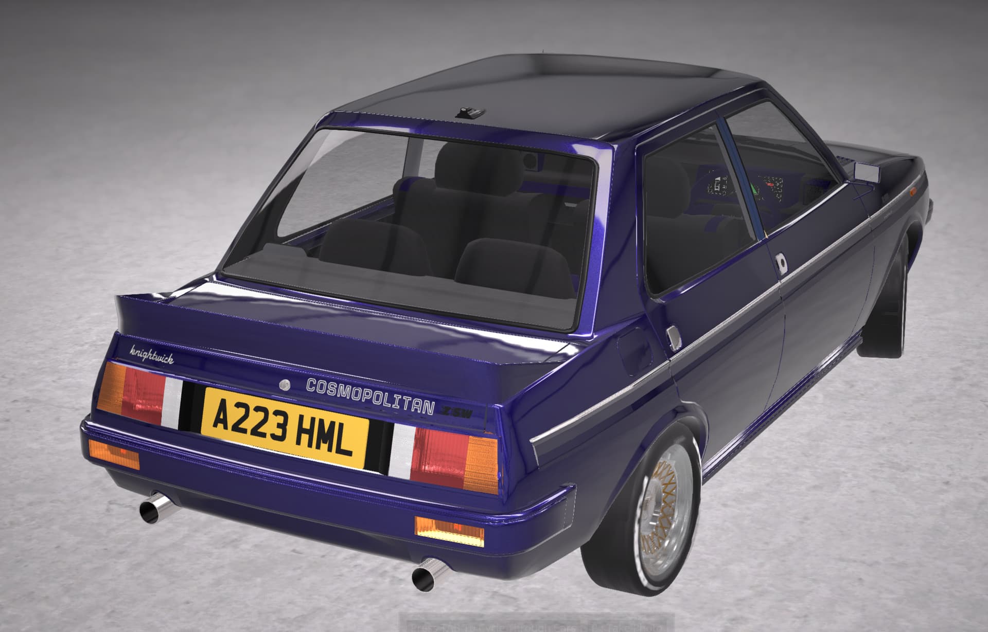 Let me talk you first of the redesing made, we made little modifications to the bodywork, mainly in aerodynamics and air flow, we inspired in many 80´s and 90´s sports cars and these modifications will really help on fuel economy and handling in the country roads of UK while maintaining the shape of the glorious Knightwick, we really see what a sporty premium version of the Cosmopolitan would be back then. Also the paint used resemblance the mythic midnigth purple, an elegant color from the 90´s that is timeless, everybody with knowledge will recognize this color among the other monochromatic aestethics of today, but it can blend into the modern cars aswell.
