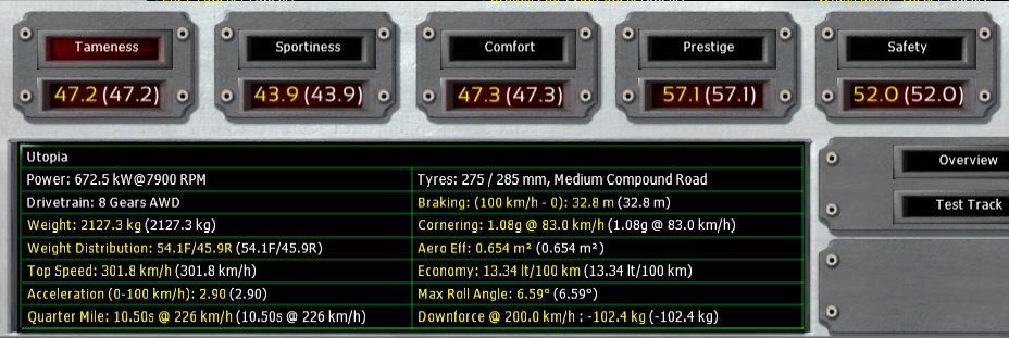 The blue line is the line for perfect tameness, so at least for the handling part of the stats you cannot have both perfect tameness and perfect sportiness. There are other things where you have to make a compromise, too. But as long as you don’t go too crazy with engine or other settings, both stats can be pretty good at the same time. Not as good as a car which is focussed on one stat of course.