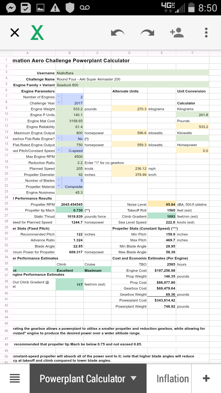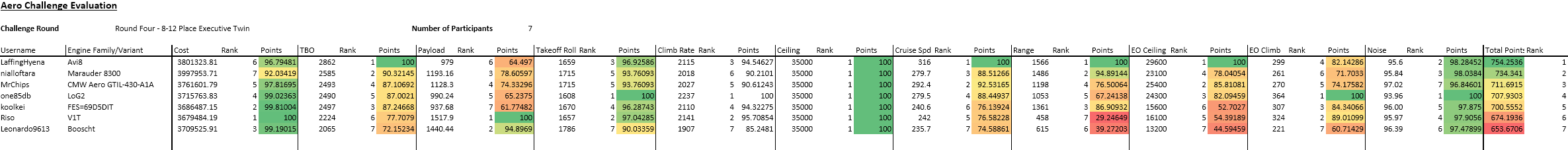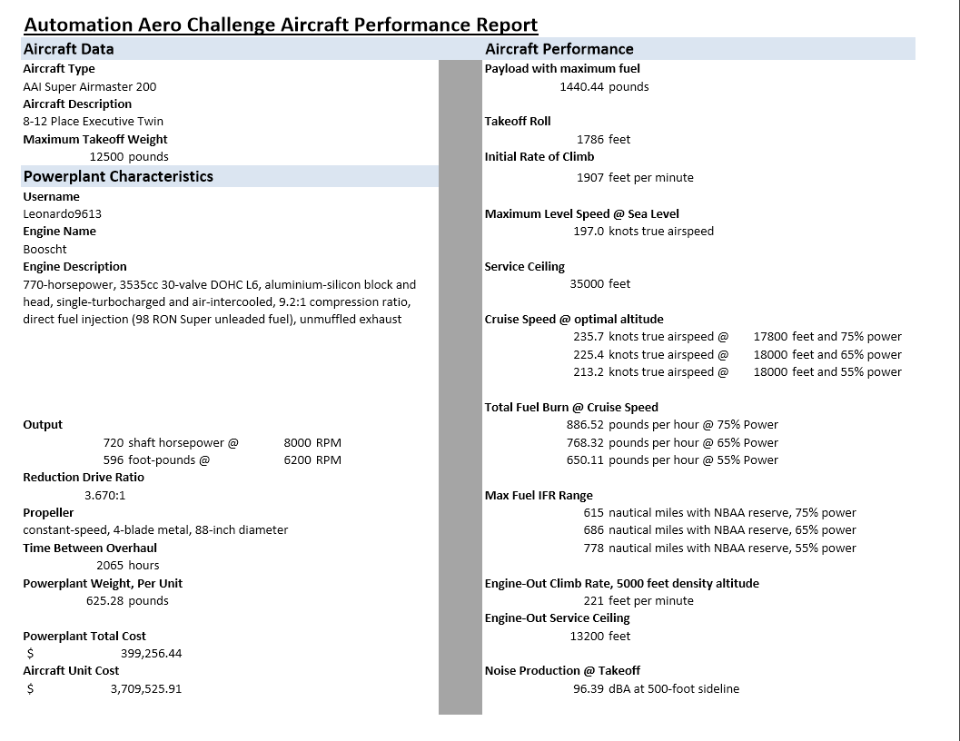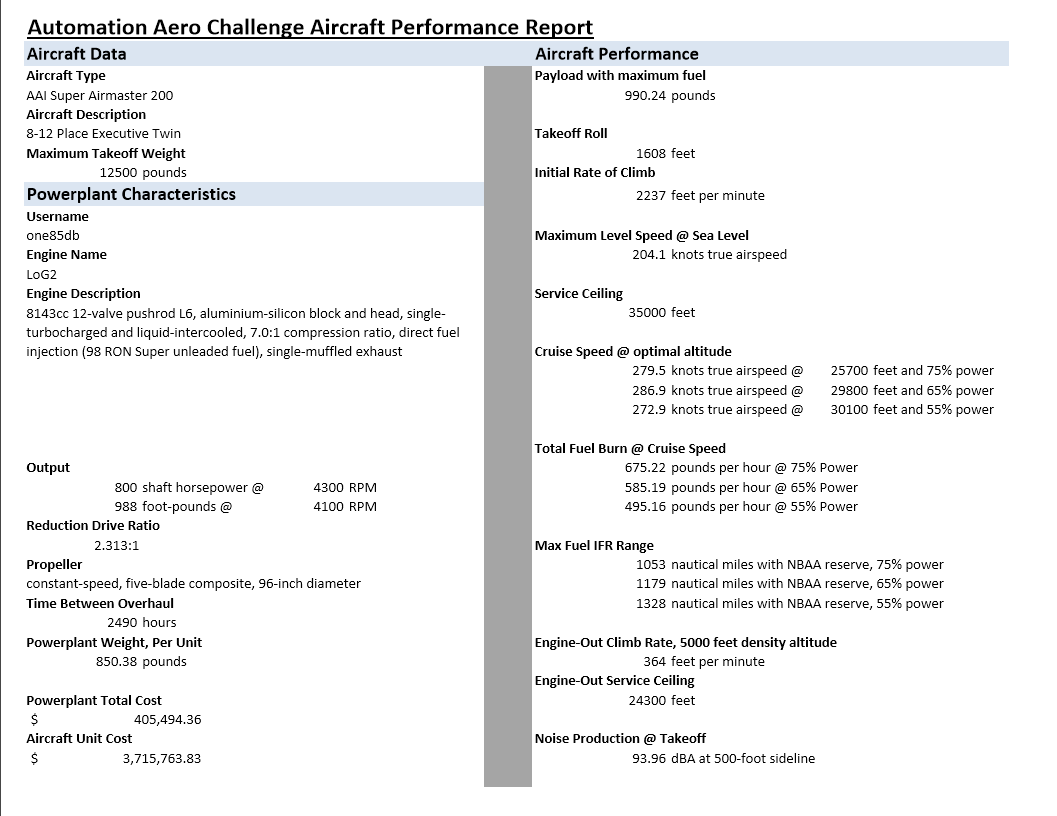 Tremendous performance, excellent speed, excellent range…just, way too expensive! I was actually pretty surprised to see a V12 so competitve in terms of weight and aerodynamics in this challenge - I thought inline-6s would rule the roost, quite wrongly in fact, as the top two engines are both vee-configuration. My guess is some of that is down to two smaller turbos rather than one big one, but even still, a surprising result regardless. Once again, nialloftara arrived at what appears to be the best possible propeller design, combining efficiency and performance with low(ish) noise. Well done!