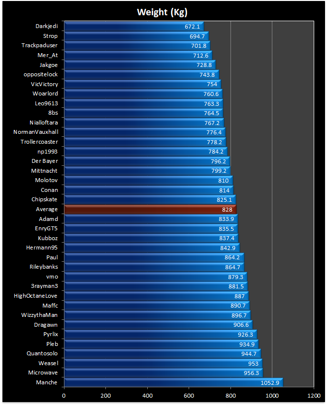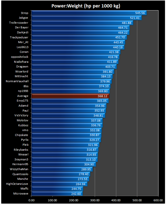 I was going to release one set of stats together with every race, but I was in a rush and simply forgot about it. So now, in between the races, I release the power, weight and power to weight comparisons.