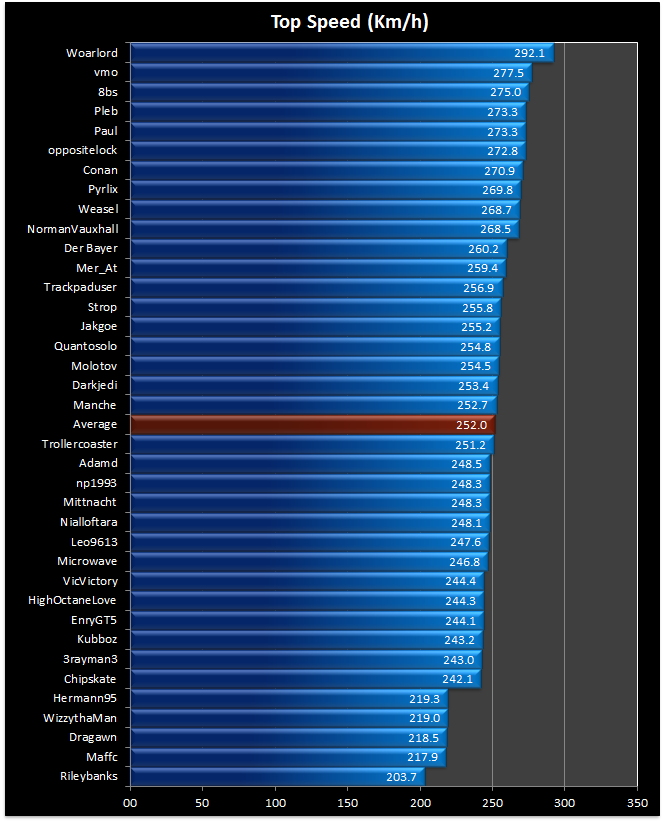 Downforce doesn’t seem to have been a huge priority for quite a few entries here. Jakgoe and I have the most powerful cars, but as you can see, the top speeds are somewhere in the middle. Trollercoaster’s car is a corner monster and has won races, and it has an even lower top speed![/quote]