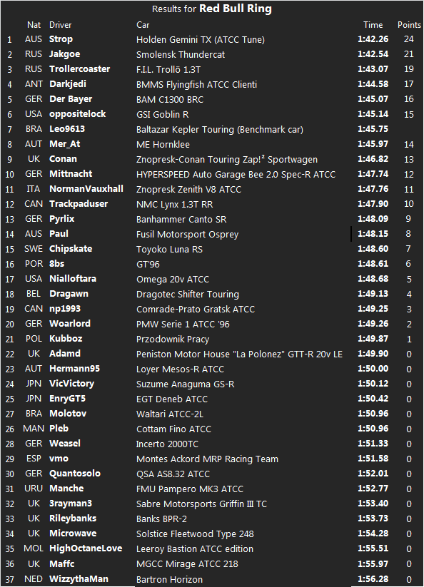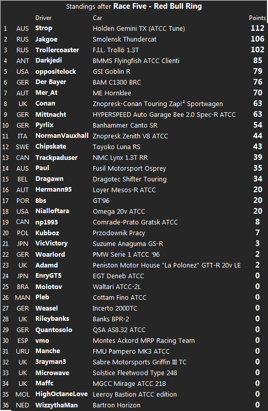 Here we have the results for the fifth race, which took place on the Red Bull Ring in Austria.