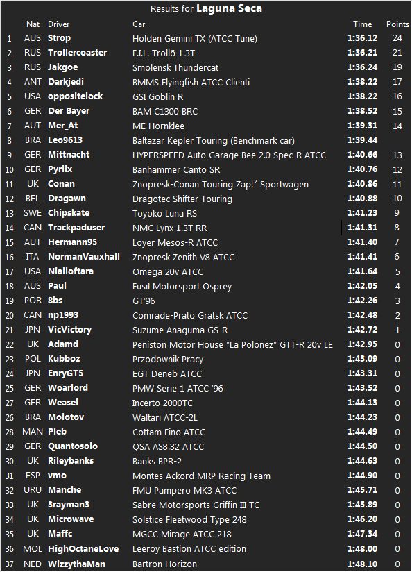 These are in fact better than expected results for the Gemini! We weren’t expecting to win Laguna Seca, in fact we were expecting to be beaten by the Trollololol and the Thundercat.