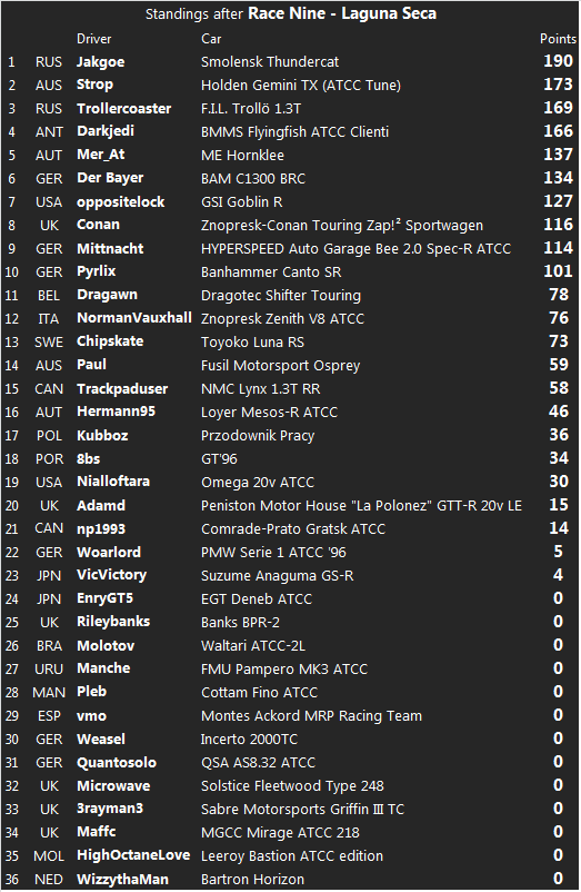 Personally I would like rules that allow a decent variety of cars. One of the things that was great for this championship is how you ended up with a lot of fairly different cars, some turbo, some NA, some RWD and some FWD. This, in addition to your track modding made for an interesting championship and it would be nice if the rules for the next one allowed variety, and didn’t just result in a contest of who can build the best FR NA engined car within regs.