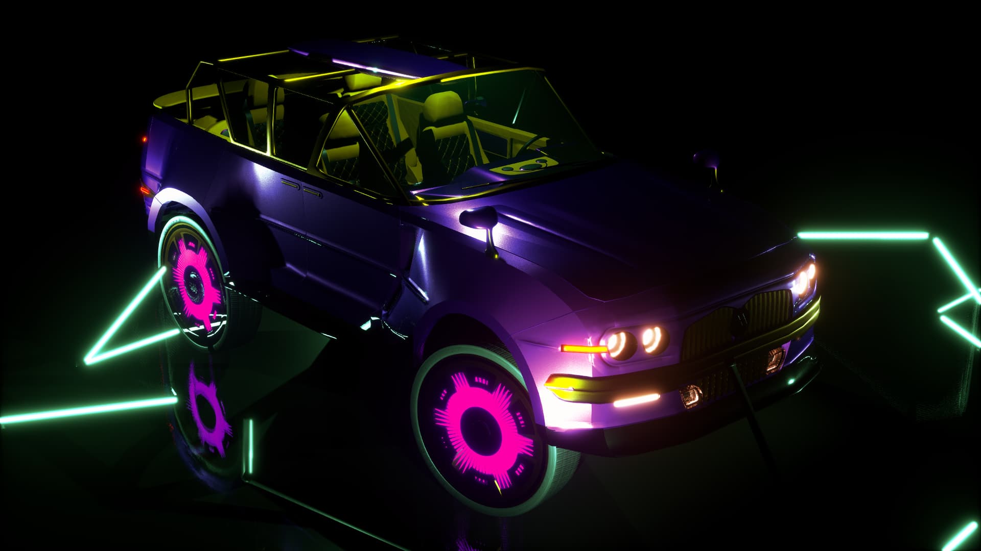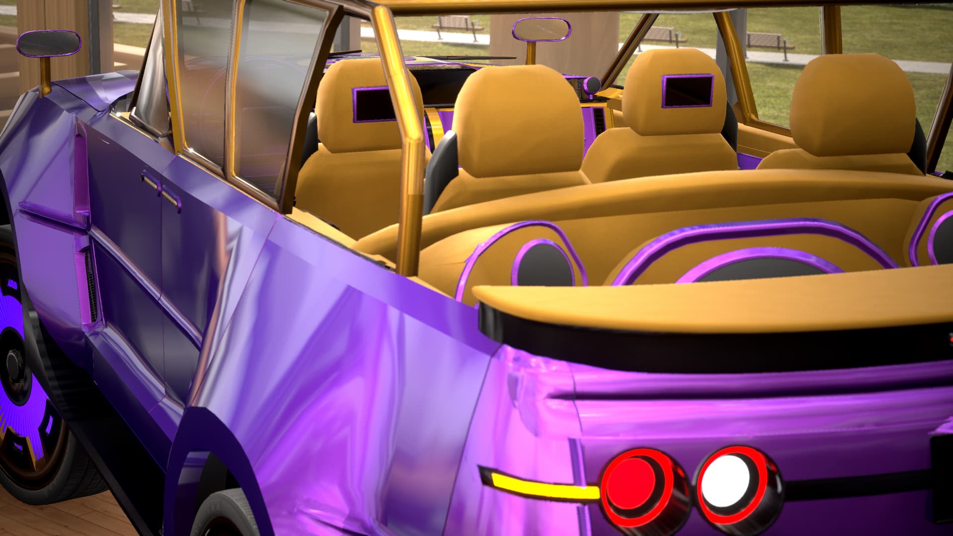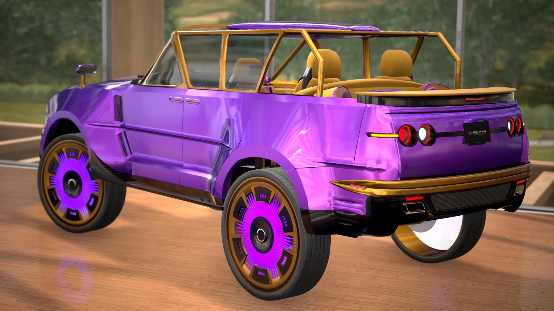 It's funny... When I initially looked at this car, it looked awful. Then, the more I looked at it, the more I thought it just looked awful because it was donked. So, I swapped out the wheels and suspension for the stock specifications... And it still looks kinda *awful*. The gold and purple colour scheme is horrendous and eyebleeding. The DJ booth, speakers and surfboard feel like something right out of Pimp My Ride. I must congratulate and commend the creative use of fixtures here - using titanium exhaust tips as custom-coloured cupholders, for instance, is genius, and re-building the windscreen is a nice touch.