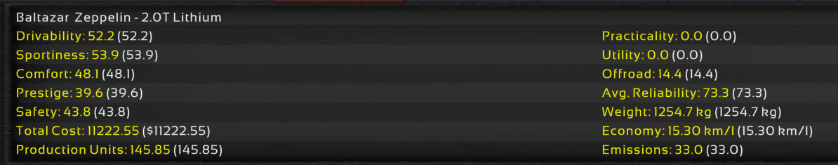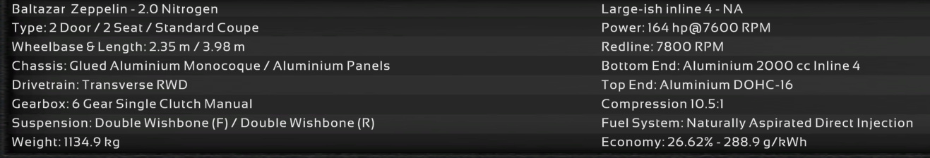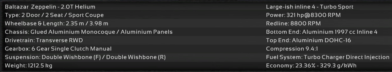 Using the new inline 4 engine family first introduced in the Quasar, the Zeppelin brings new levels of performance and driver engagement. The range is comprised of three tunes of the 2.0 motor, the base naturally aspirated model, with 165 hp, and two turbo units, with 277 and 321 hp.