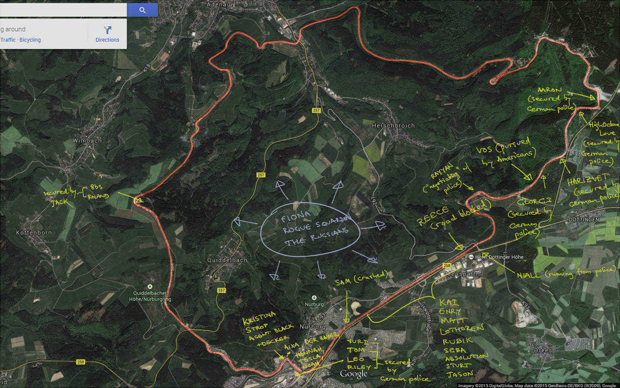 Way up the front, Kai and Sam were oblivious to the troubles behind, already streaking down the straight. With more and more police cars and armored vans peeling through the entrance onto the road, what was once a clear stretch of road going into the left kink of Antoniusbusche, became more like a two hundred mile an hour dodgem course. The comparatively lumbering pursuers had no chance, and the two part time pro drivers, part time daredevils laughed maniacally as they carved lines around the cars. It was an affair made doubly difficult by shrapnel, spike strips, caltrops and what Kai could have sworn was burning glass on the road. After running off the road for about the thirtieth time, he couldn’t tolerate it anymore, and started yelling randomly through the radio:
