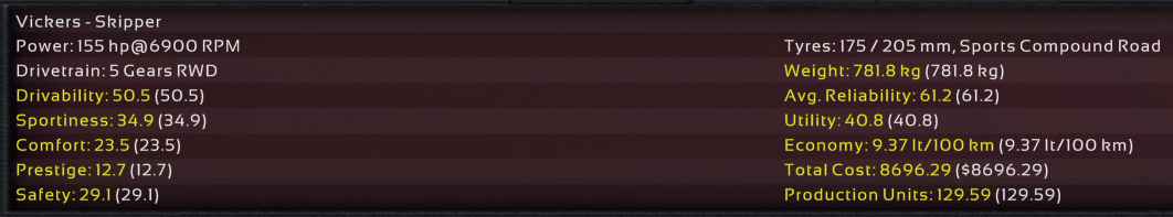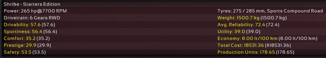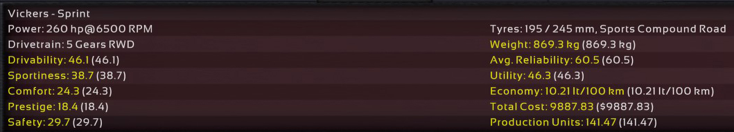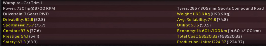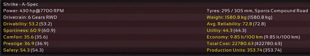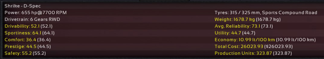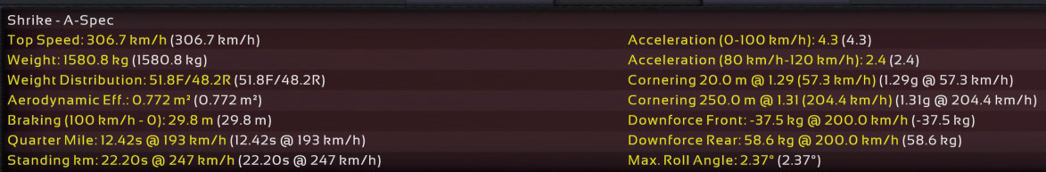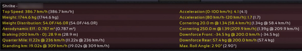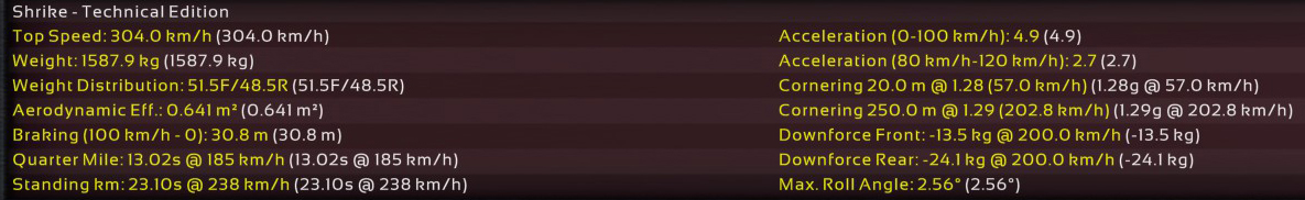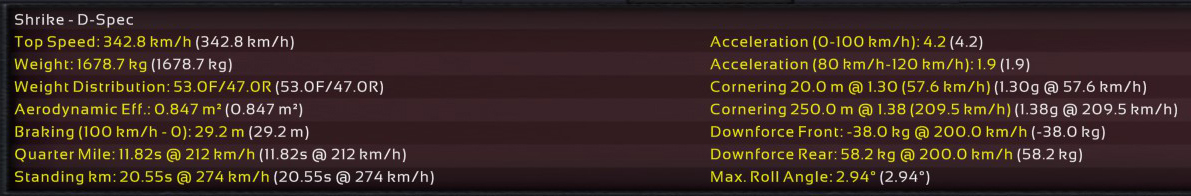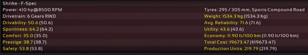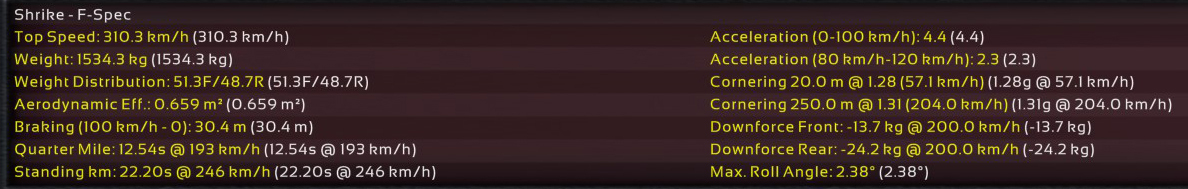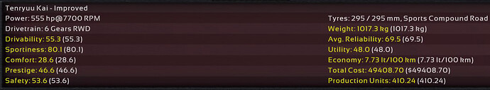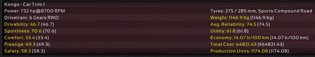 11th Incident: 8th Prototype, redesigned internals, 6900cc DOHC V8, 850hp @ 8100rpm on Octane 98 fuel. Bristol covers as test driver once again; Raquel was assigned to assist Ukyo for the