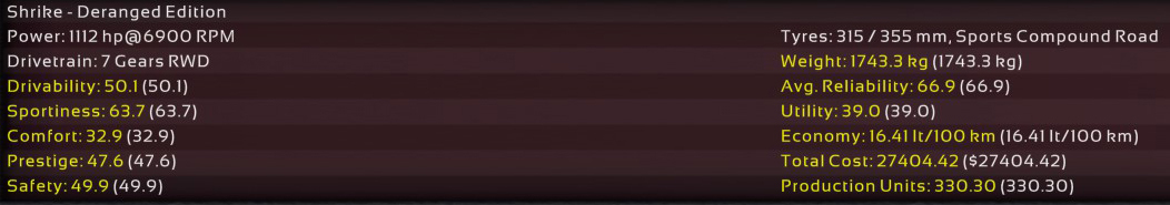 I can’t remember if I said this already, but the top end versions of the Shrike sit right in between the originals and the GG retunes of the Znopresk Zeus, it’s surprising. And a car with this kind of power curve that generates over 1000hp also tickles me in the right spots… I’d love to see a head to head.