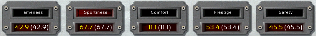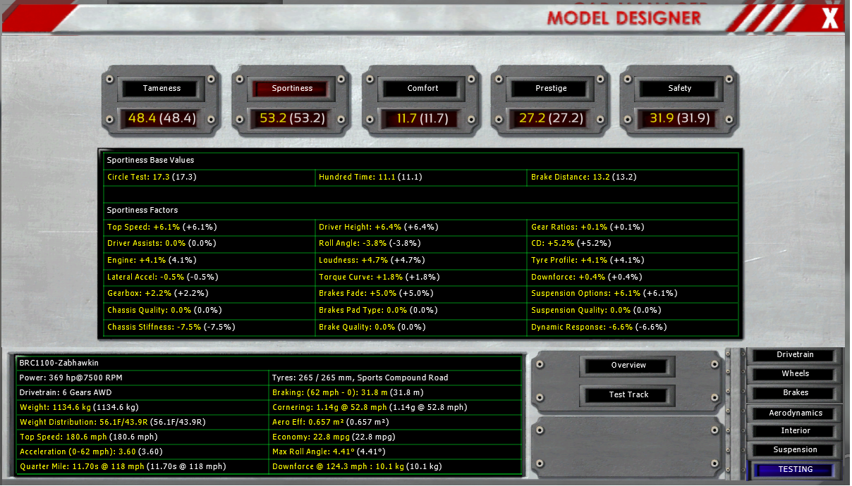 My car could turn at 1.25gs at 55.3mph compared to your cars 1.16g at 53mph. My car is significantly faster then yours in the corners and got a tameness rating of 20 while you got 47. Maybe there is something about those numbers I am missing.