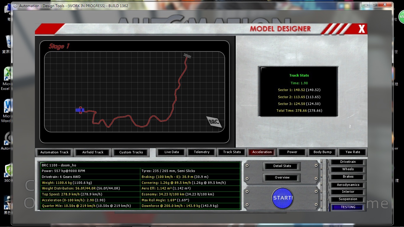 Both cars are made using the absolute lightest materials possible as a result I just started adding adding safety gear and so on to both of the cars to reach the weight limit. So my drivers are some of the safest in the contest. The S1000 car ended up so light that I had to add a hand crafted interior, premium safety, a standard entertainment system, and halfway up the sound proofing just to get it to the weight limit (even using engines 20% to 30% heavier then anyone else). So yea… a 200kph, 0-100 in 5.7 seconds, and 1.25g at 89kph luxury sitting room. Comfy