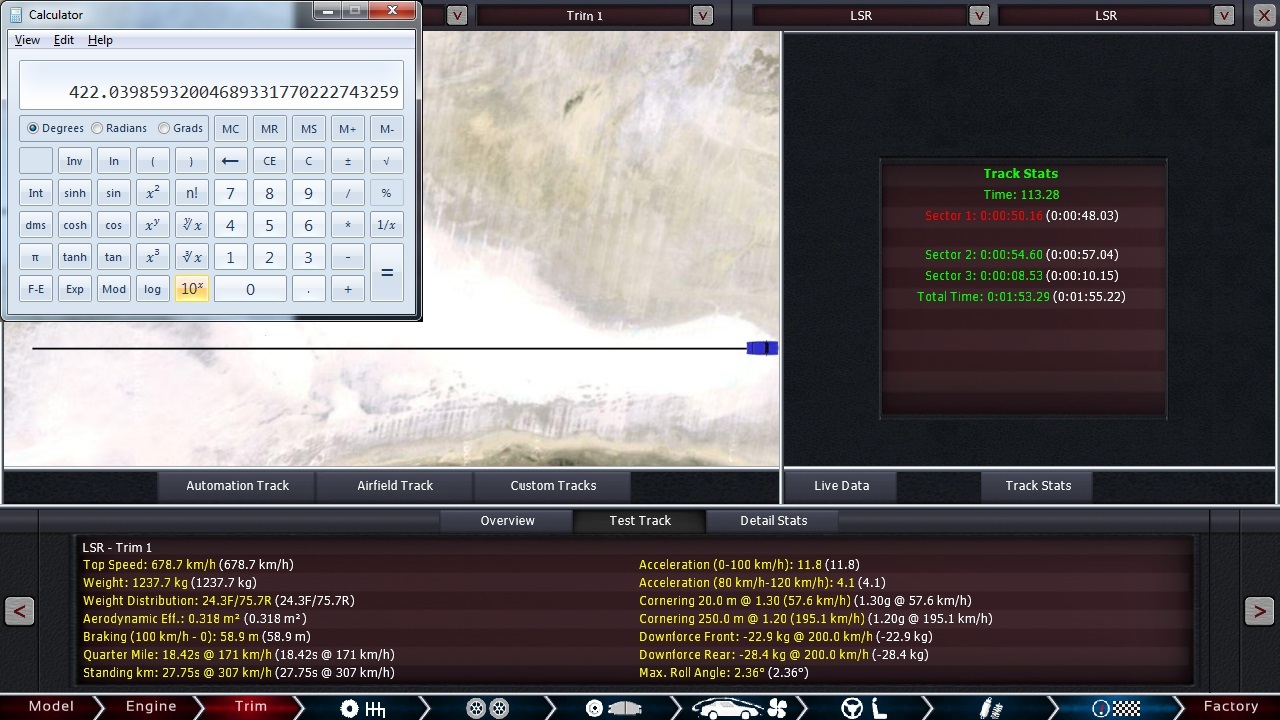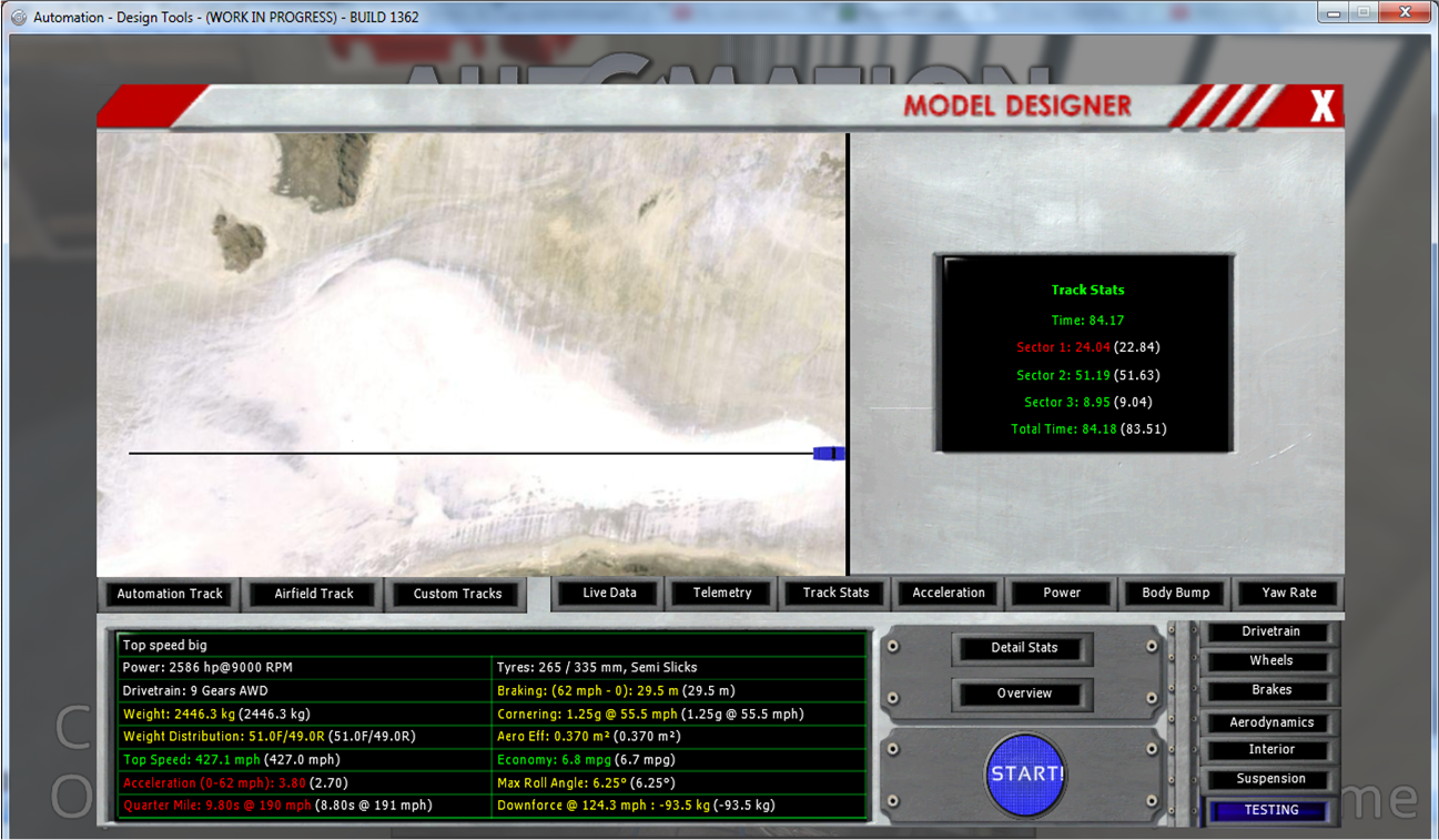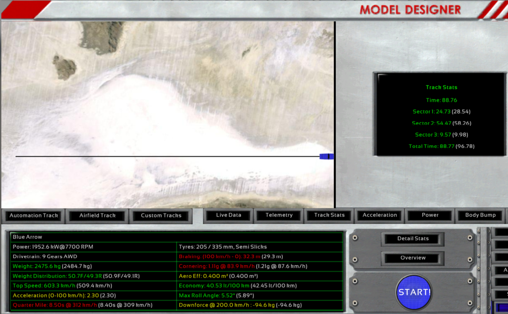 Splits are set at mile 1 (e.g. standing-start mile time) and mile 6. The world speed record is set based on the time taken to get from mile 6 to to the finish line, the “flying mile”. You can easily determine your speed over this segment by dividing 3600 by your sector 3 time. E.g. 15.0 seconds = 3600/15 = 240mph. Bonneville.zip (1.08 MB)