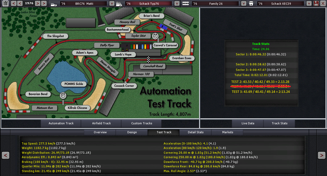 In the future I will probably deactivate the slight laptime randomness in training sessions (still it will be active in qualifying and race). This should help seeing the relation to the ingame performance. However please have in mind that if you submitted cars with different power, the low power one will most likely lose more time in my simulation than the high-powered one. And cars with good cornering are likely to suffer more from tyre wear compared to bad cornering cars. 5% of 1.2 g is more than 5% of 1.0 g. It is all very difficult to keep the overview over why cars behave the way they do. But we already gained a lot of transparancy when the updated track calculations made it from my simulation into the game. I can promise that the base calculations are 100% the same. The only differences can be caused by: a) balance changes I did not pick up on or was not notified about and b) the added fuel/tyre wear/randomness stuff.