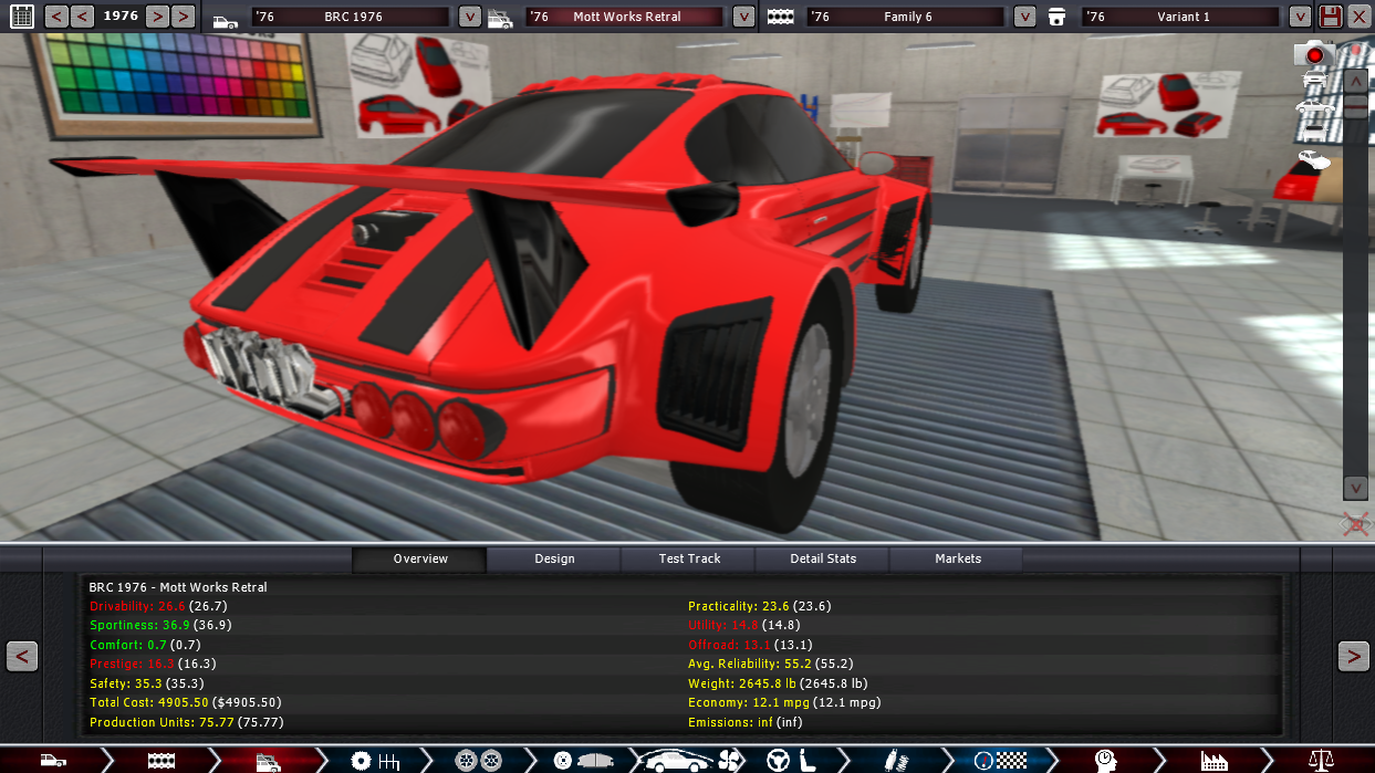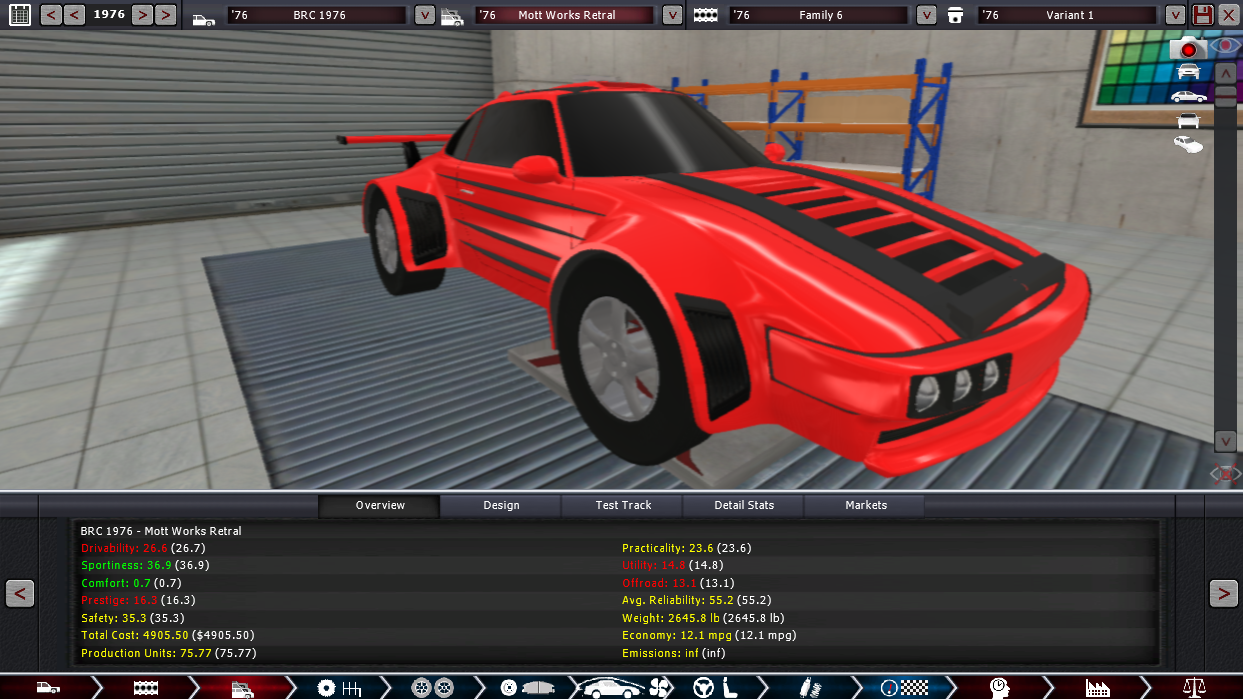 The 1976 Mott Works Retral in BRC racing trim. Powered by a turbocharged 3.5L V6 designed to be durable and fuel efficient. The car runs on sports compound tires and has a great weight distribution at 25F/75R meaning that under hard acceleration its likely this car could do wheelies since there is only about 664lbs over the front axle.