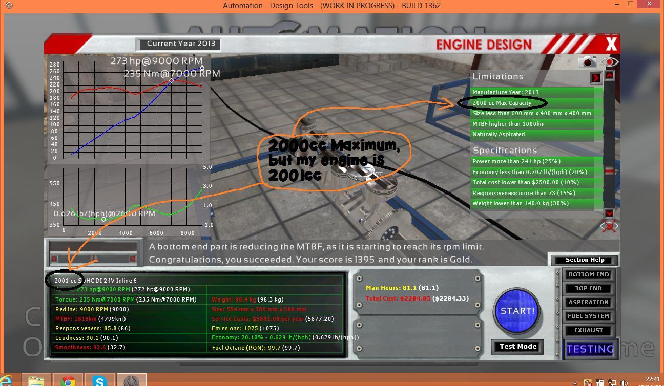 The max. capacity limit is 2000cc, but my engine is 2001cc and it still indicated that my engine meets all the requirements. I think this may be to do with changing the bor and stroke by 1 click at a time, and it may mess with the calculations. Or maybe the game rounds the value to the nearest integer (e.g 2000.6cc → 2001cc).