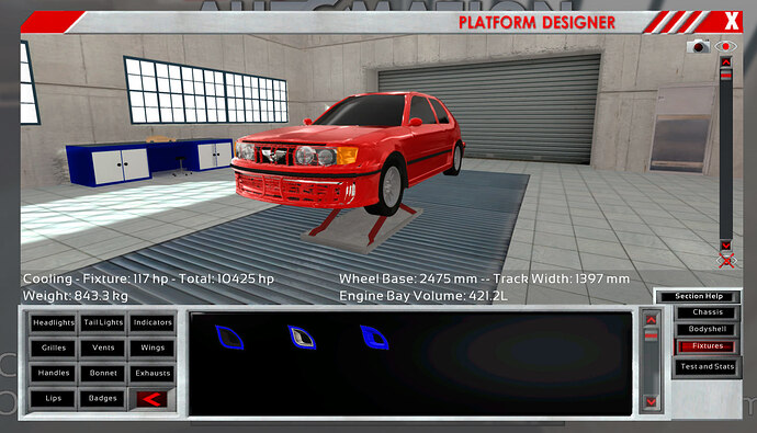 I love what’s here so far, just wish there was a way to also modify your fixtures within each model - sometimes I just want a basic chassis that has the ‘minimum’ of what I desire - say, lights, doors, decal location/type, shape, etc etc to use as a basis for the car models…but with each individual model I want to be able to toy with things like the vents, grills, and other things that actually have an affect on the car’s performance or other things that are clearly ‘extra’. Having to create countless platforms just to move a grill around is a pain. Sure technically it may just be a revision number you change to denote those mods, but it’s still an extra slot that clutters up the platform list.