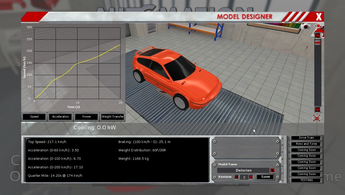 Two bugs i can think of right now; the game crashes if i extend the top speed much past 350mph, every time, and you can put vents on top of grills on top of vents and still get a cooling boost, sometimes exponentially. ie: