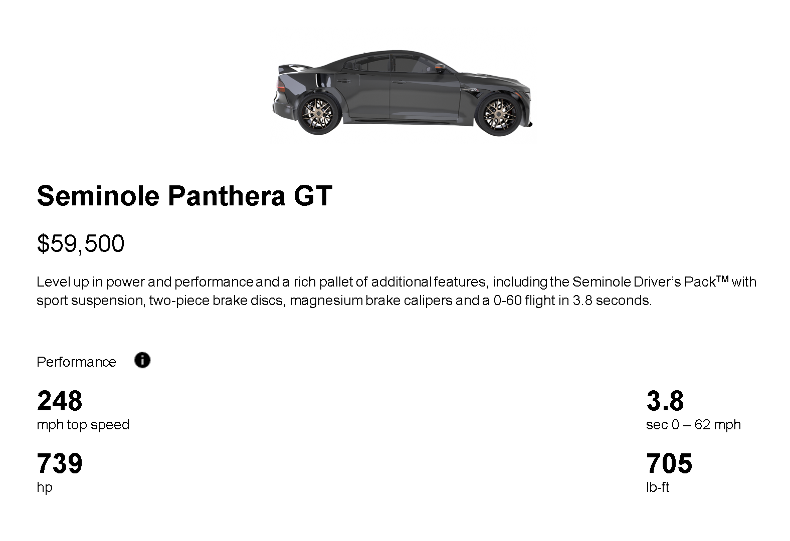 The Panthera’s sleek and elegant design evokes feline form and agility. Emphasizing its Native American heritage, the manufacturer Seminole, has developed a premium-performance sedan. Reinforcing its established racing legacy, Seminole engineered a turbocharged 4.7L V10 engine that delivers 739 horsepower and 705 lb-ft of torque.