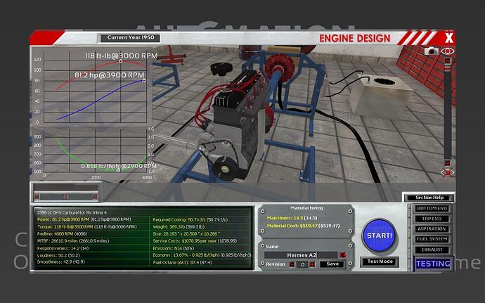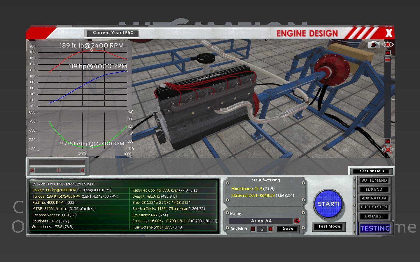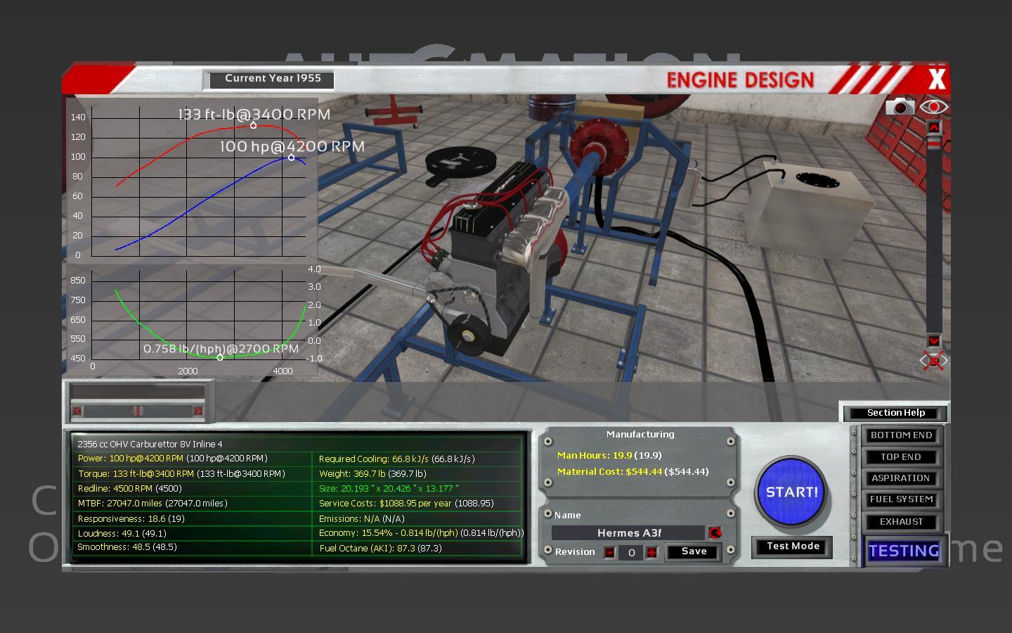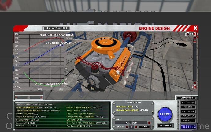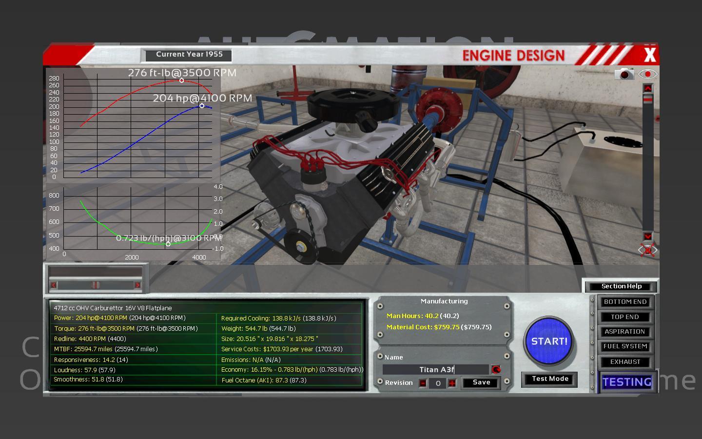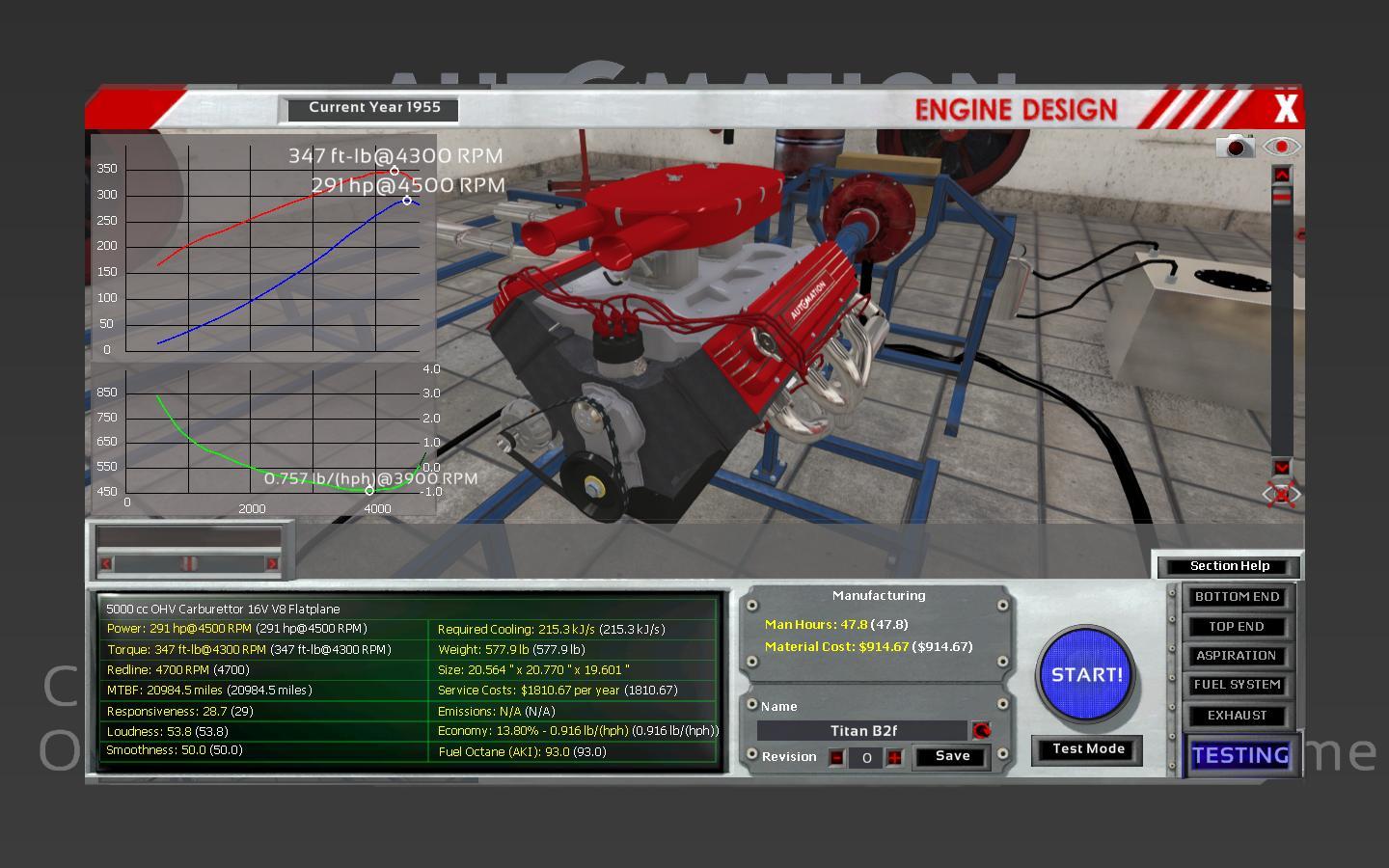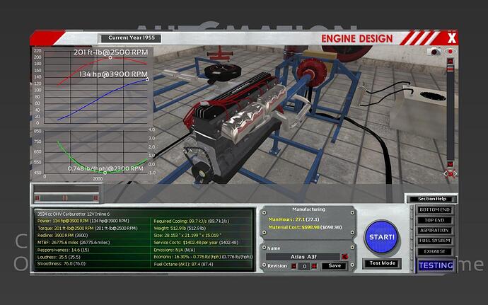 I’ll be doing my best to construct engines that evolve over several decades, starting with the 40’s I’ll try to build engines robust and affordable for the returning troops, in the 50’s with the v8 as the rising king I’ll try to keep the robustness with a healthy splash of street racing power gas was cheap and the emission tests not even a pipe dream yet. The golden 60’s will see the 50’s engines growing larger and evolving materials will boost power outputs but with lines of more affordable 6 cyliders emerging . the gas crisis of the 70’s hit America hard and most companies suffered through with choked and nutered versions of their big block 60’s engines running poorly on the newer weaker unleaded gas with very little efficiency and horrible emissions . Enter Centauri motors, armed with a head full of ideas will try to combat gas costs with smaller engines to stay competive against the waves of imports. Those smaller engines will ride the technology wave of the 80’s, turbos, fuel injection and higher qualities along with the start of the smaller 4 cylinder sports cars. The 90’s will see the end of many older American engine designs as finally the 20th century comes to a close, new engine lines will start with great increases in standard technology. The 2000’s and 10’s will see these new designs begin their own tuning and improvement cycles with a tendency to increase economy with every revision. This will be a automotive evolution that I’ll try my best to keep historically accurate, the gaps between engine revisions will grow shorter as the decades progress to try and simulate the technology curve.
