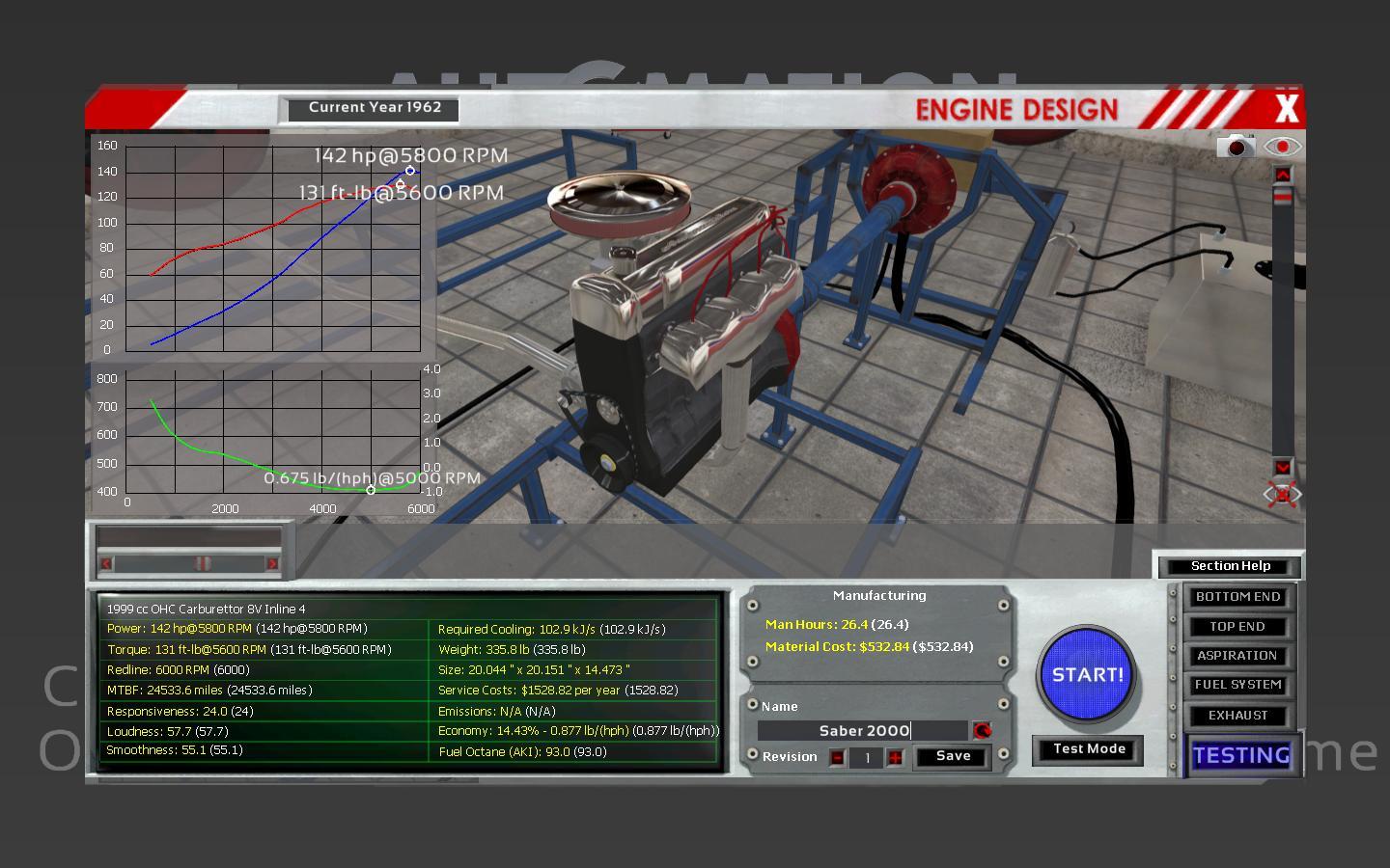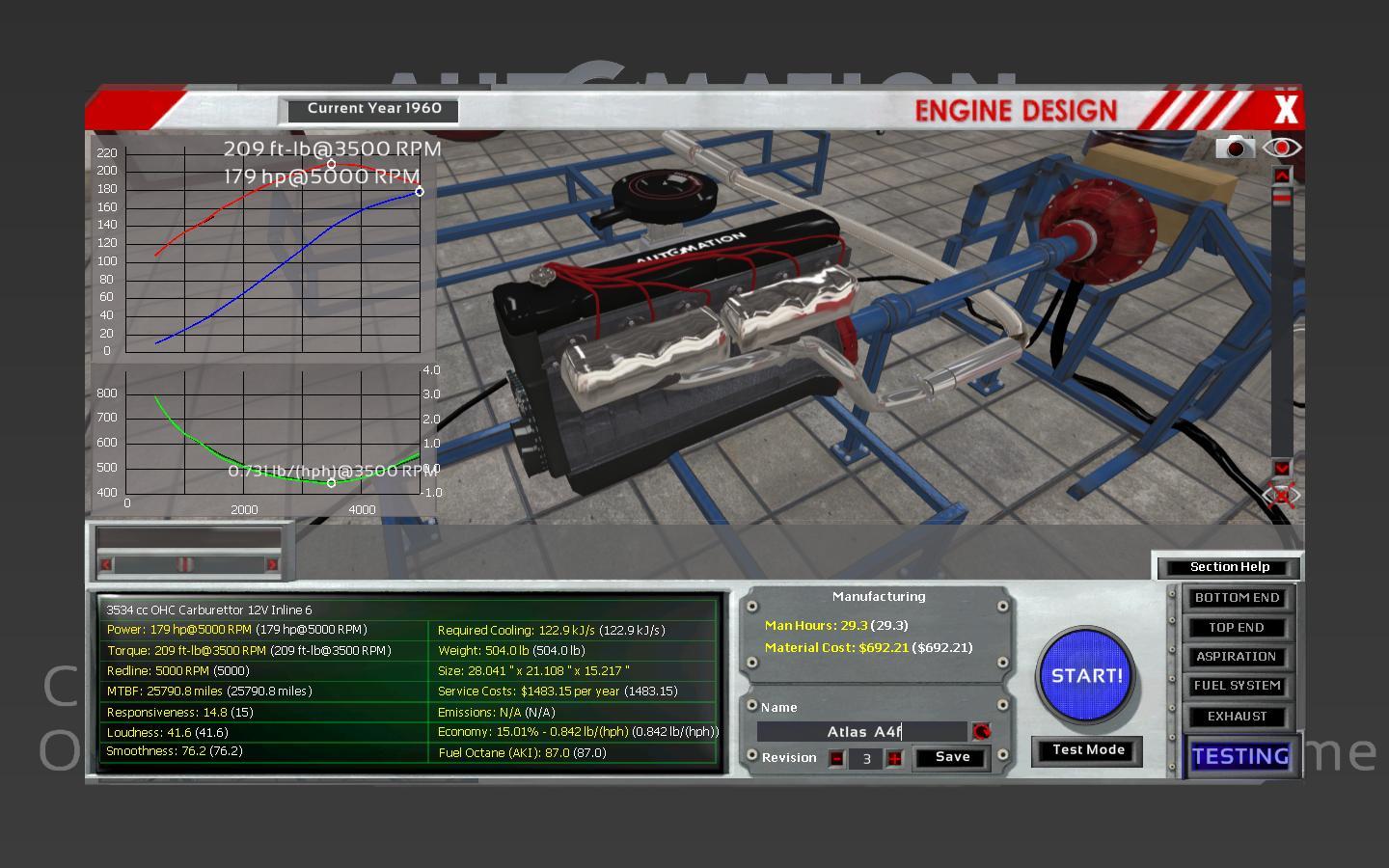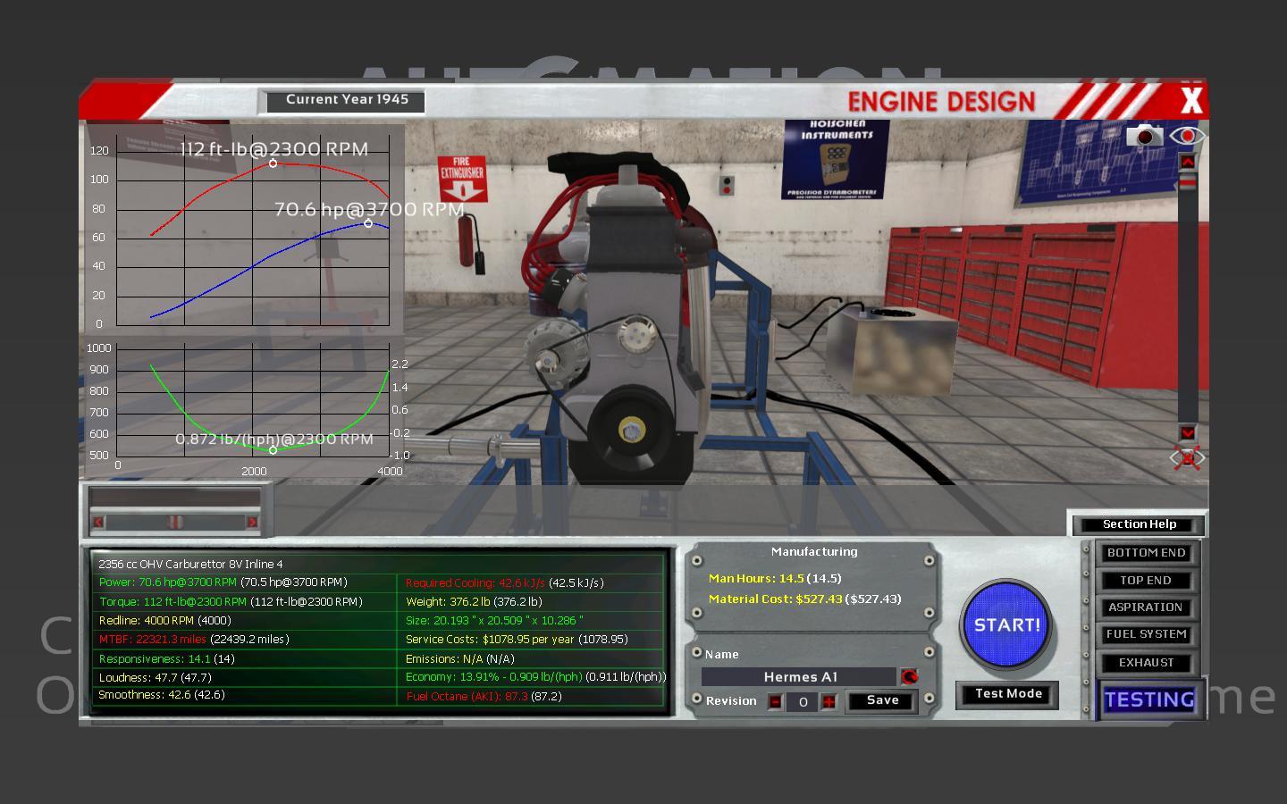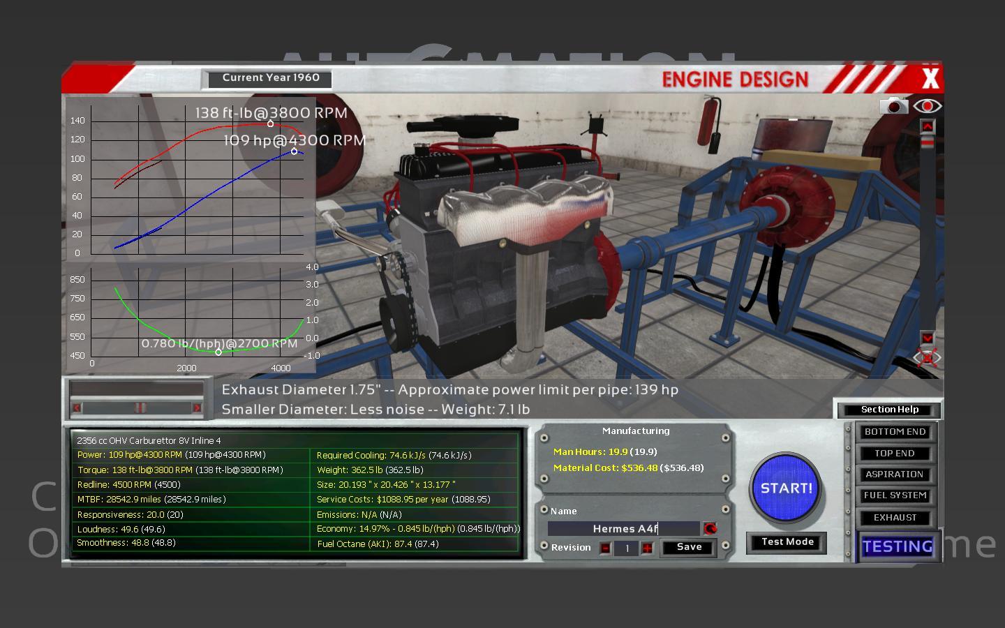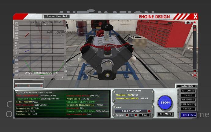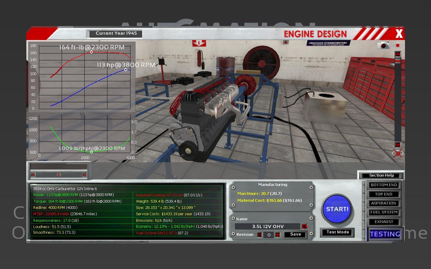 I’ll be doing my best to construct engines that evolve over several decades, starting with the 40’s I’ll try to build engines robust and affordable for the returning troops, in the 50’s with the v8 as the rising king I’ll try to keep the robustness with a healthy splash of street racing power gas was cheap and the emission tests not even a pipe dream yet. The golden 60’s will see the 50’s engines growing larger and evolving materials will boost power outputs but with lines of more affordable 6 cyliders emerging . the gas crisis of the 70’s hit America hard and most companies suffered through with choked and nutered versions of their big block 60’s engines running poorly on the newer weaker unleaded gas with very little efficiency and horrible emissions . Enter Centauri motors, armed with a head full of ideas will try to combat gas costs with smaller engines to stay competive against the waves of imports. Those smaller engines will ride the technology wave of the 80’s, turbos, fuel injection and higher qualities along with the start of the smaller 4 cylinder sports cars. The 90’s will see the end of many older American engine designs as finally the 20th century comes to a close, new engine lines will start with great increases in standard technology. The 2000’s and 10’s will see these new designs begin their own tuning and improvement cycles with a tendency to increase economy with every revision. This will be a automotive evolution that I’ll try my best to keep historically accurate, the gaps between engine revisions will grow shorter as the decades progress to try and simulate the technology curve.