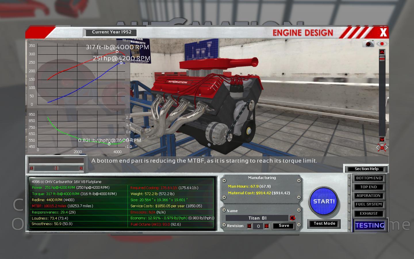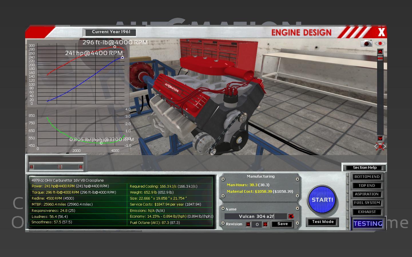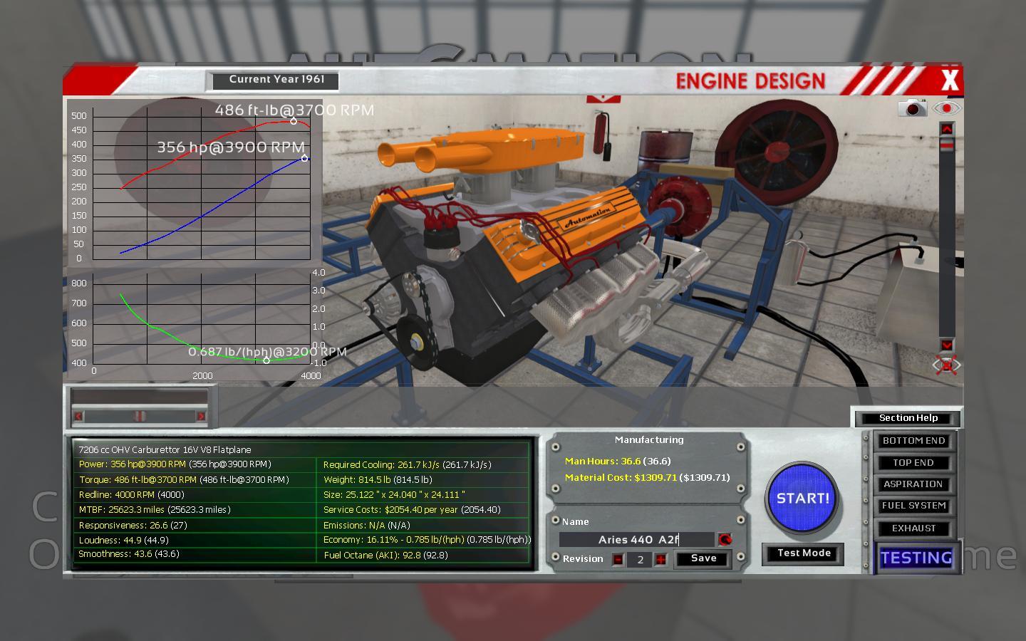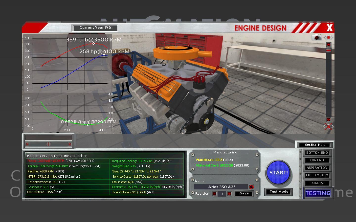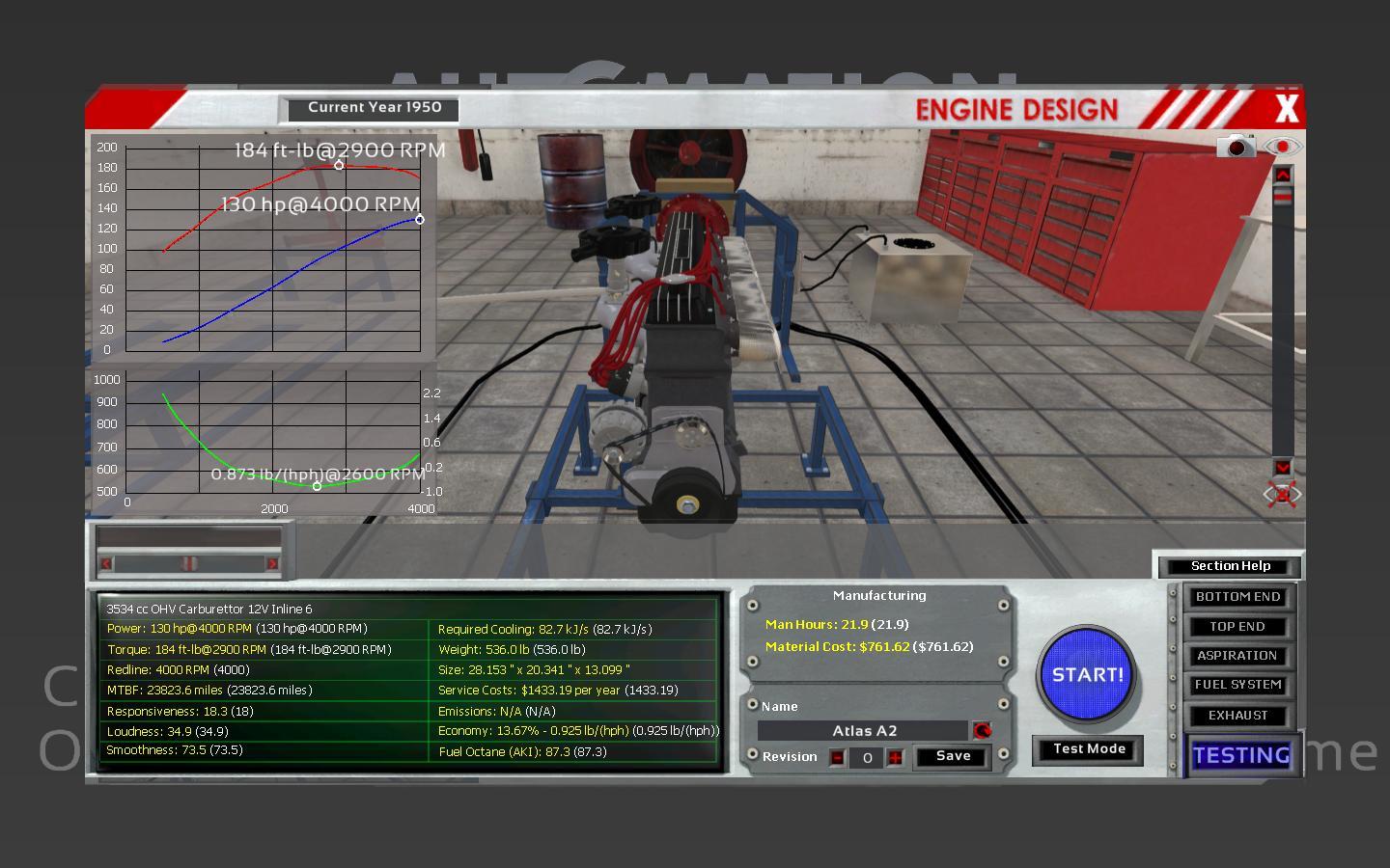 I’ll be doing my best to construct engines that evolve over several decades, starting with the 40’s I’ll try to build engines robust and affordable for the returning troops, in the 50’s with the v8 as the rising king I’ll try to keep the robustness with a healthy splash of street racing power gas was cheap and the emission tests not even a pipe dream yet. The golden 60’s will see the 50’s engines growing larger and evolving materials will boost power outputs but with lines of more affordable 6 cyliders emerging . the gas crisis of the 70’s hit America hard and most companies suffered through with choked and nutered versions of their big block 60’s engines running poorly on the newer weaker unleaded gas with very little efficiency and horrible emissions . Enter Centauri motors, armed with a head full of ideas will try to combat gas costs with smaller engines to stay competive against the waves of imports. Those smaller engines will ride the technology wave of the 80’s, turbos, fuel injection and higher qualities along with the start of the smaller 4 cylinder sports cars. The 90’s will see the end of many older American engine designs as finally the 20th century comes to a close, new engine lines will start with great increases in standard technology. The 2000’s and 10’s will see these new designs begin their own tuning and improvement cycles with a tendency to increase economy with every revision. This will be a automotive evolution that I’ll try my best to keep historically accurate, the gaps between engine revisions will grow shorter as the decades progress to try and simulate the technology curve.
