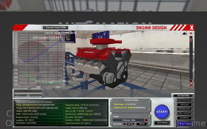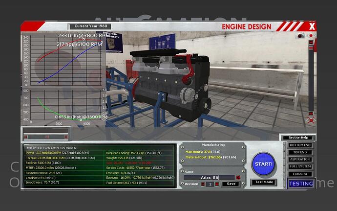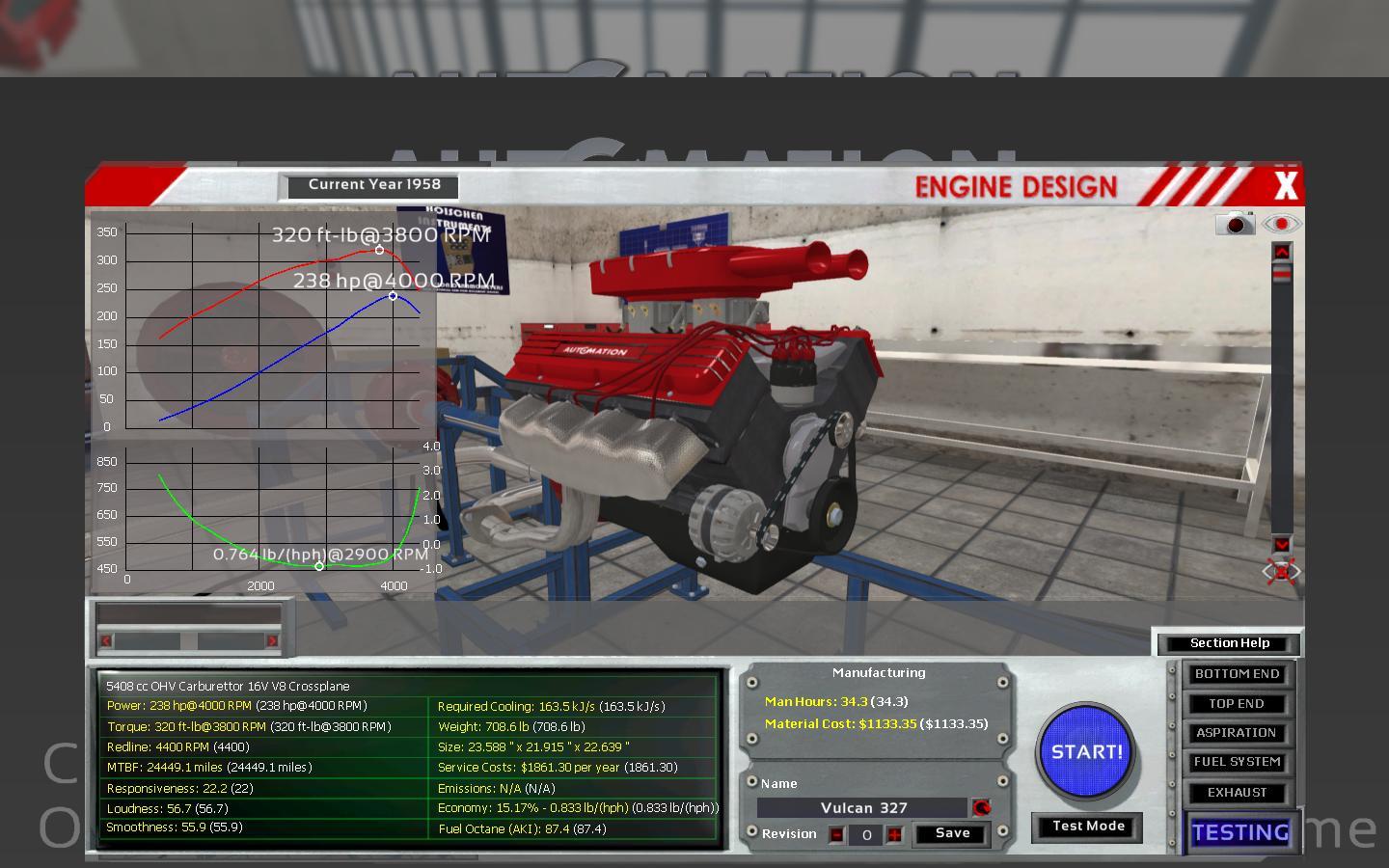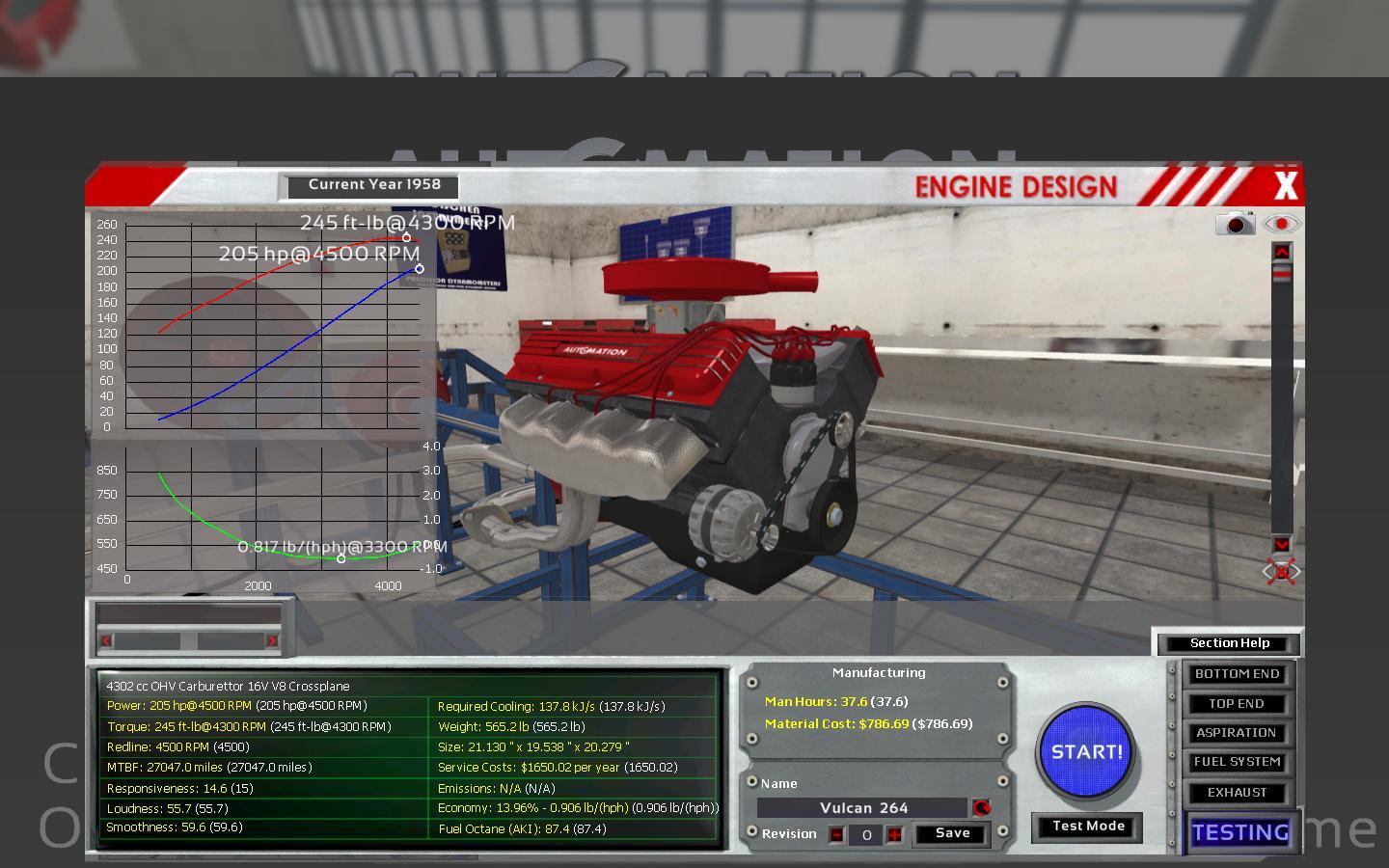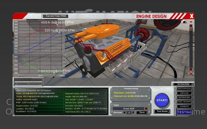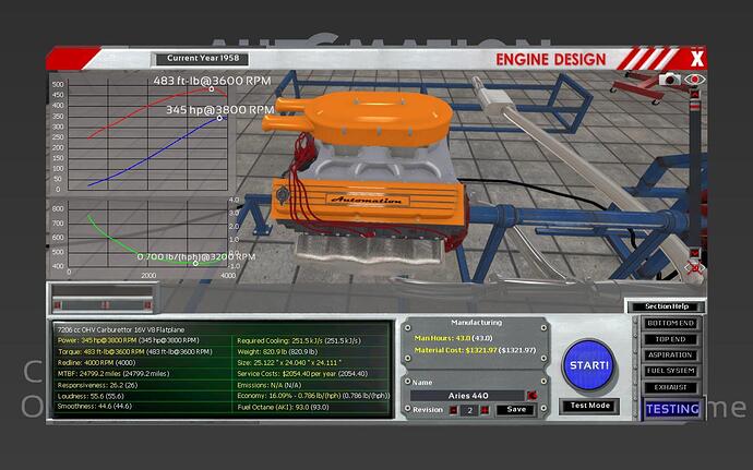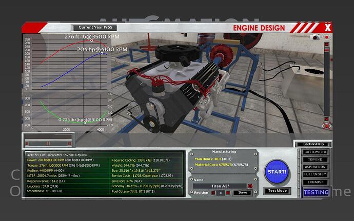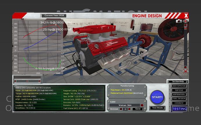 Welcome to 1958 and big news From the engineering staff at Centauri’s Advanced motor works shed. The aging Titan engine is no longer able to meet the performance demands of you our customers, and so this year we retire out workhorse v8 and usher in the two new and far more flexible lines to replace it, the small block Vulcans and the big block Aries. Before unveiling those however we are doing a final limited run of the high performance Titan B series as a send off in style to a faithful breed.