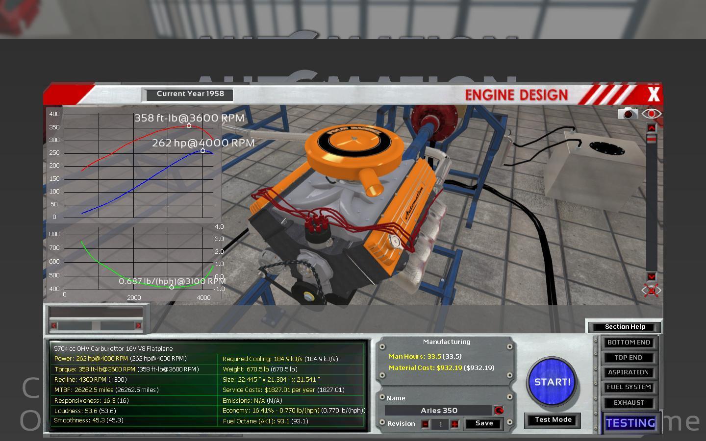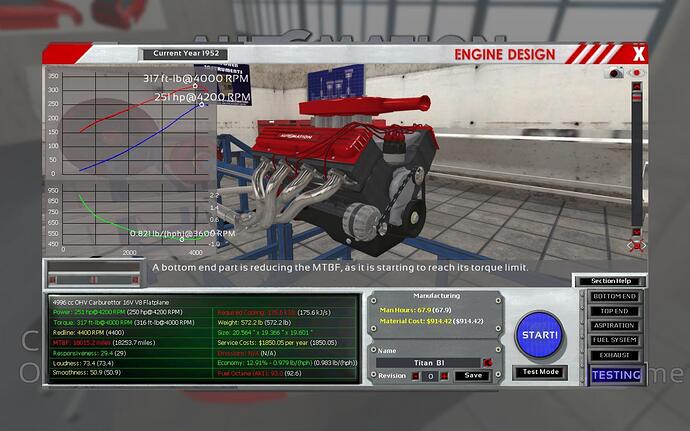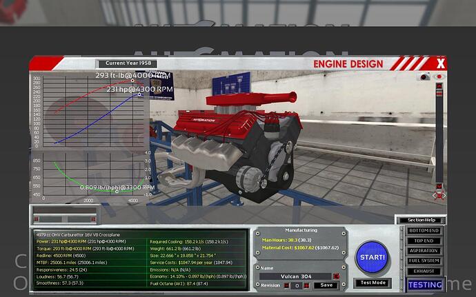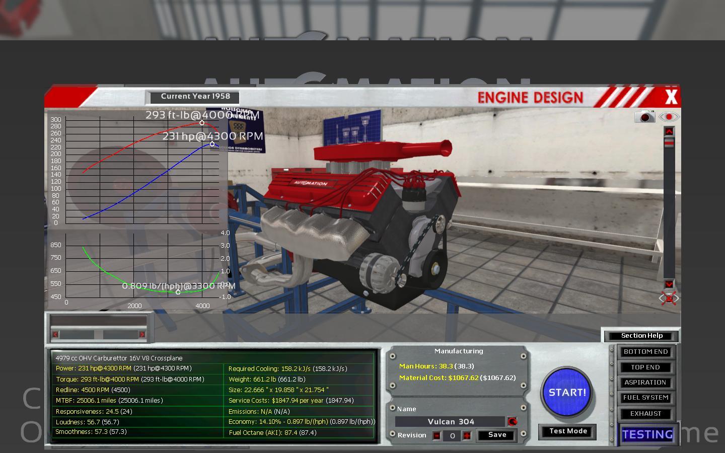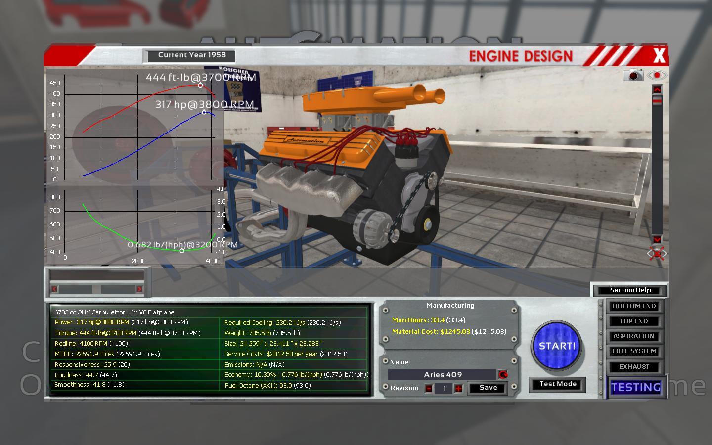 Welcome to 1958 and big news From the engineering staff at Centauri’s Advanced motor works shed. The aging Titan engine is no longer able to meet the performance demands of you our customers, and so this year we retire out workhorse v8 and usher in the two new and far more flexible lines to replace it, the small block Vulcans and the big block Aries. Before unveiling those however we are doing a final limited run of the high performance Titan B series as a send off in style to a faithful breed.