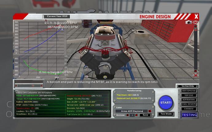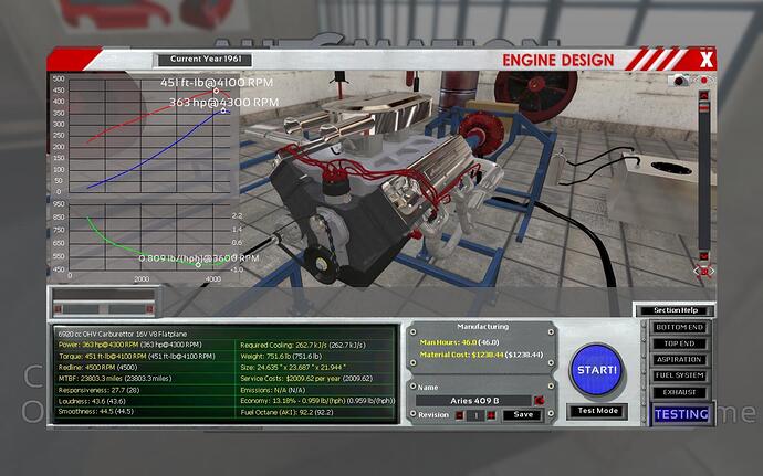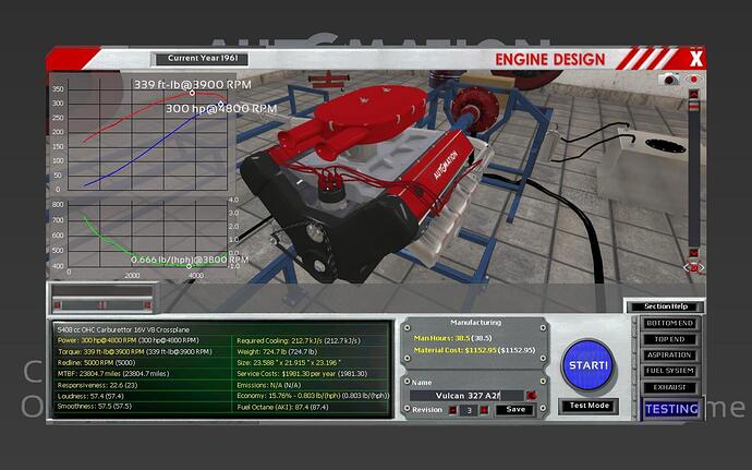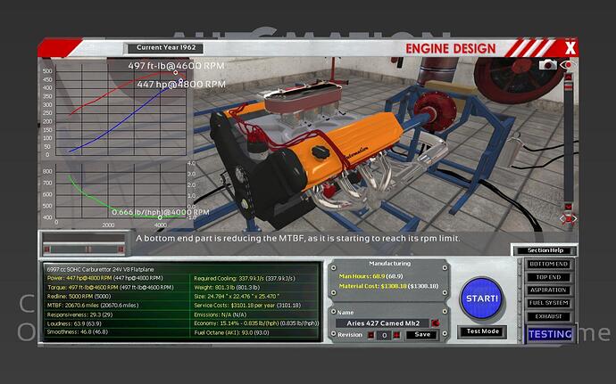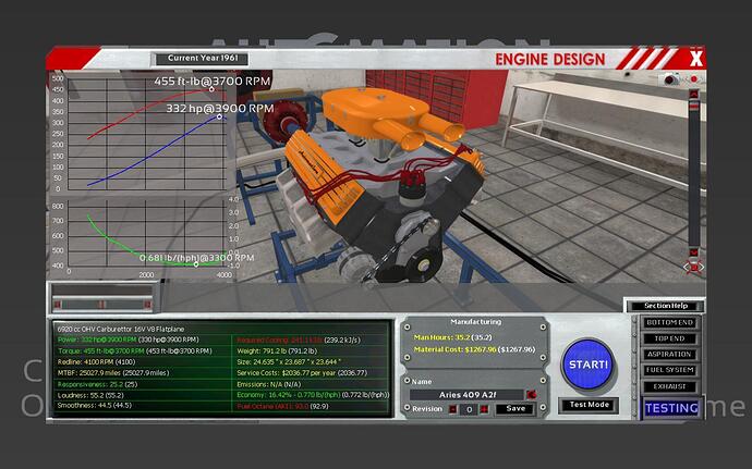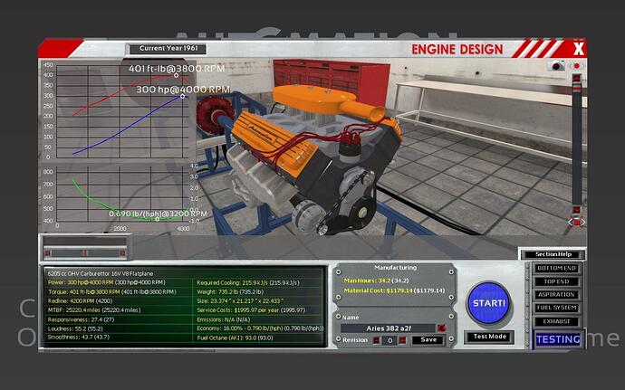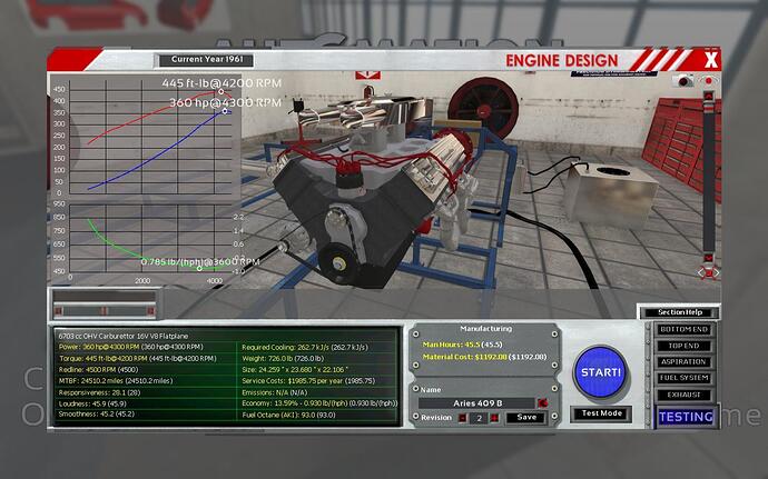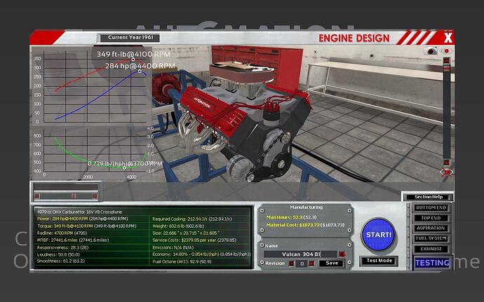 As a note I’ve been uses these times as a kind of guide to check my engines out. caranddriver.com/features/ro … ion-page-2 Currently in the car manager I can fit all the small blocks and the 350 + 382 big blocks into a car, the 1/4 mile times in a 3450lb car with 4 speed transmission and sport street tires are between 16.3 and 17.4. top speed is set at 119mph to better simulate the close gearing of the 3.96 and 4.11 gears used on tester models back then. The best times were with the limited Titan B3f which could cover the quarter in the mid 15 second range @ 98mph