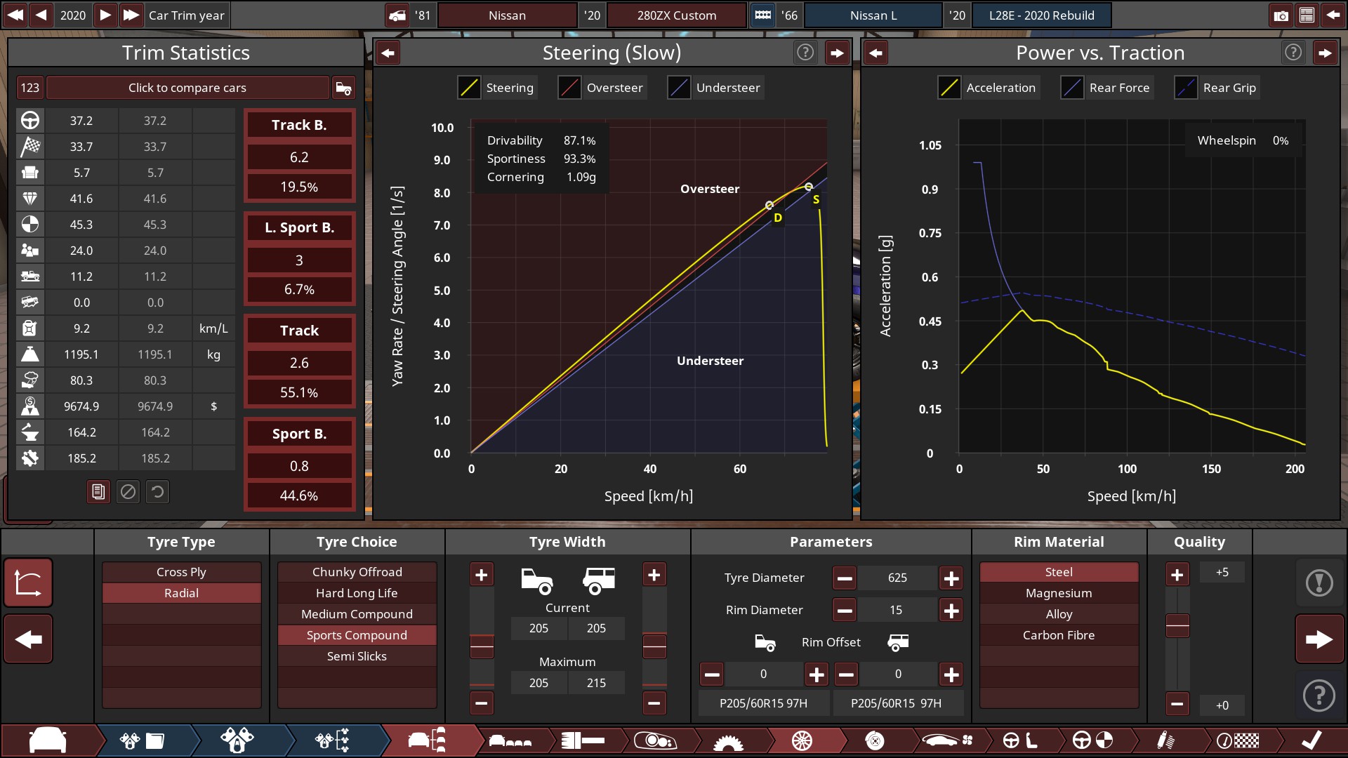 Brakes - What you see here for brake calipers and rotor diameters is actually correct for the real car. From the factory they come equipped with disc brakes in all 4 corners with the fronts being ~250mm rotors and 1 piston calipers and the rears being ~270mm calipers and 1 piston calipers. The game definitely does not like this setup and I know that newer cars (basically almost anything built after my car) has the larger diameter rotor up front, but this is how the 280ZX was built and sold. I have done a lot of playing with pad type and brake bias but the car still wants to spin the back end around under heavy braking.