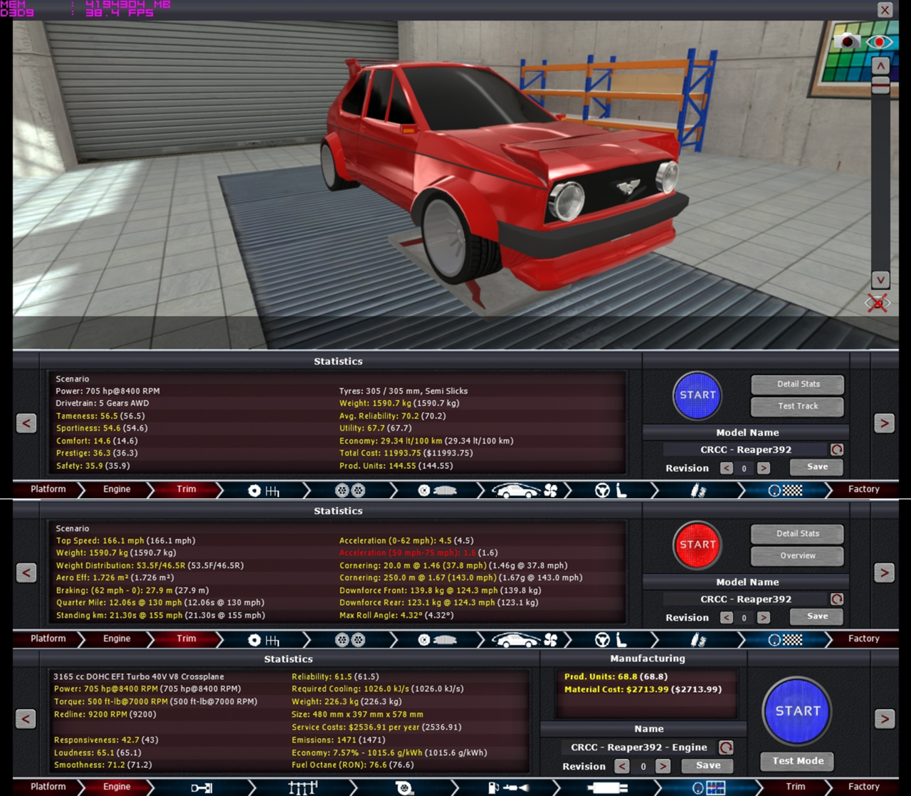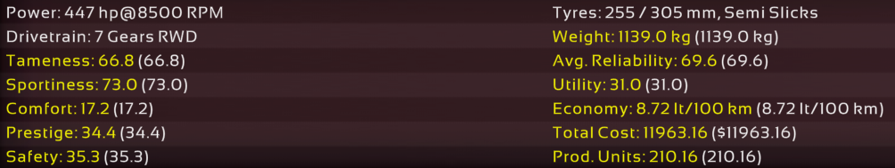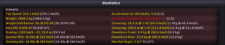 4th place and not too far behind top 3 in time, much better than I expected considering what engines it’s going against. Since everyone is posting their car stats I might as well dump some images too.