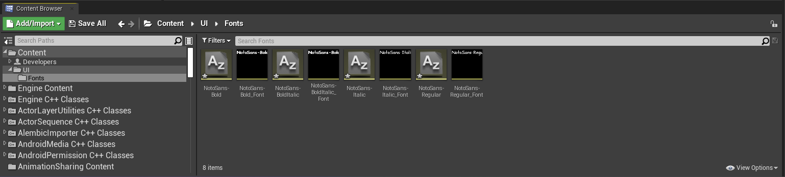 Now you can drag and drop those files into the Unreal Engine editor into our Fonts folder we created earlier. In the popped up dialog box click Yes to all. Your Content Browser should look like this now: