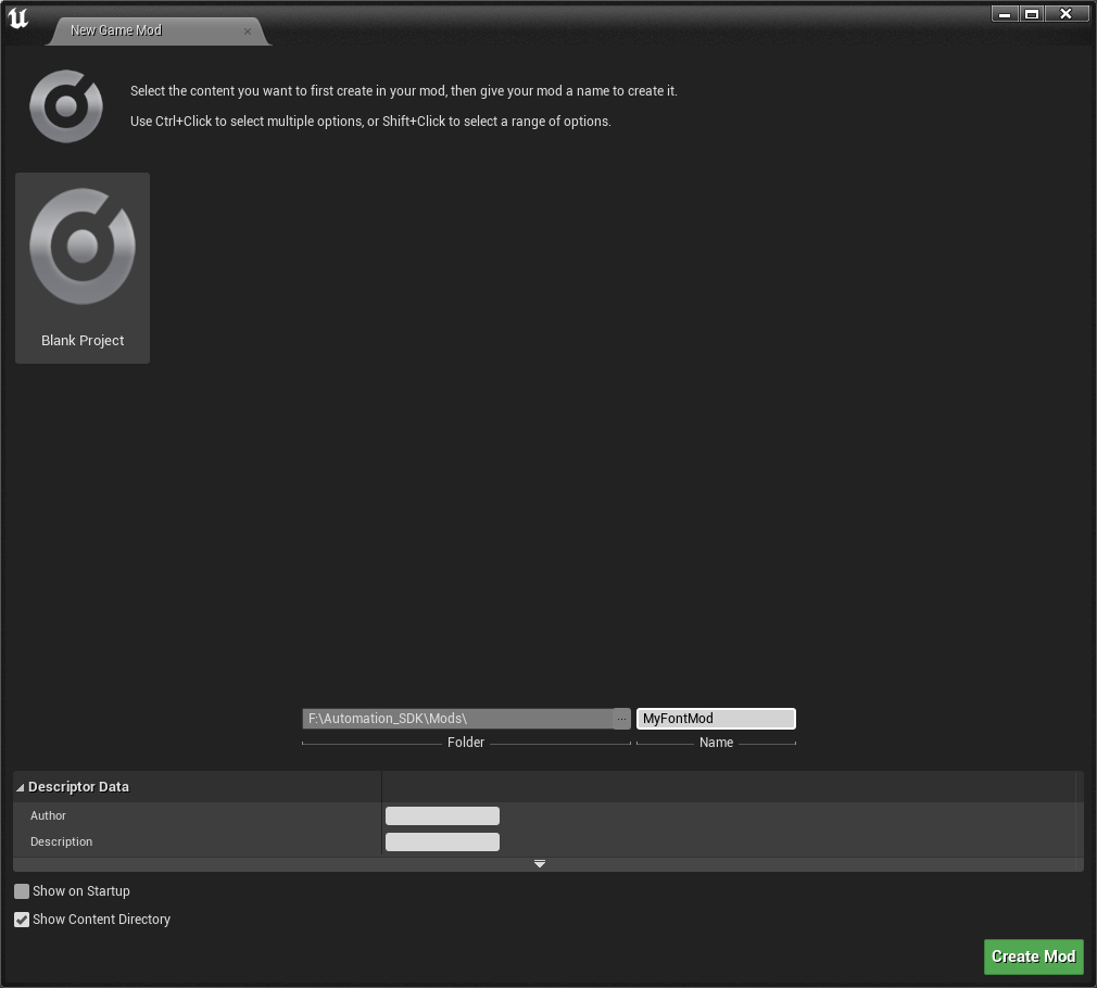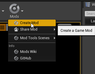 Now you can switch to the Automation SDK project in Unreal Engine. Once opened, at the top center panel click Mods > Create Mod. Close the editor and open it again so the new mod is correctly registered by the editor.
