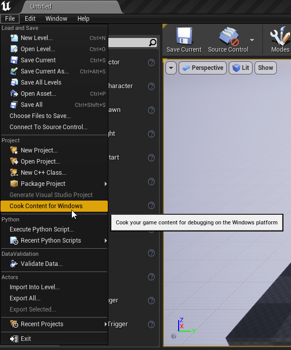 Now in the top left corner of the editor window navigate to Files > Cook Content for Windows.