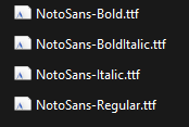 Now we need to prepare the font files themselves. The default Noto Sans font comes in the following variations: Regular, Bold, Italic, BoldItalic. If the font you want to use does not have all of them you can duplicate the existing files the fill in the missing ones.