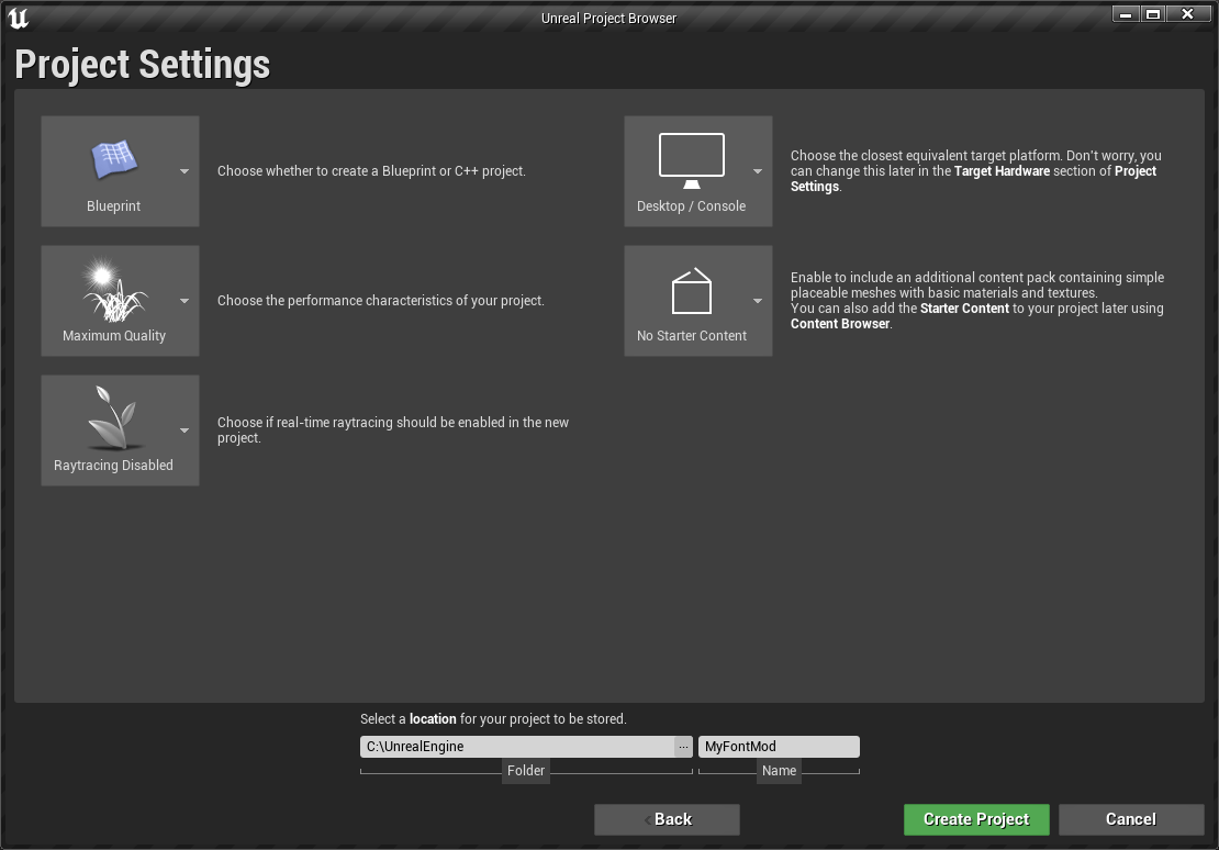 The first thing you want to do is open Unreal Engine and create a new blank project. Choose not to add starter content, simply create a blank project, this will be used to create a custom package for the replacement files.Now set up the directory structure in a way that mimics the structure of the game’s files we are going to replace. For that, open the Content Browser and under Content create a folder called UI, inside that folder create another one called Fonts.