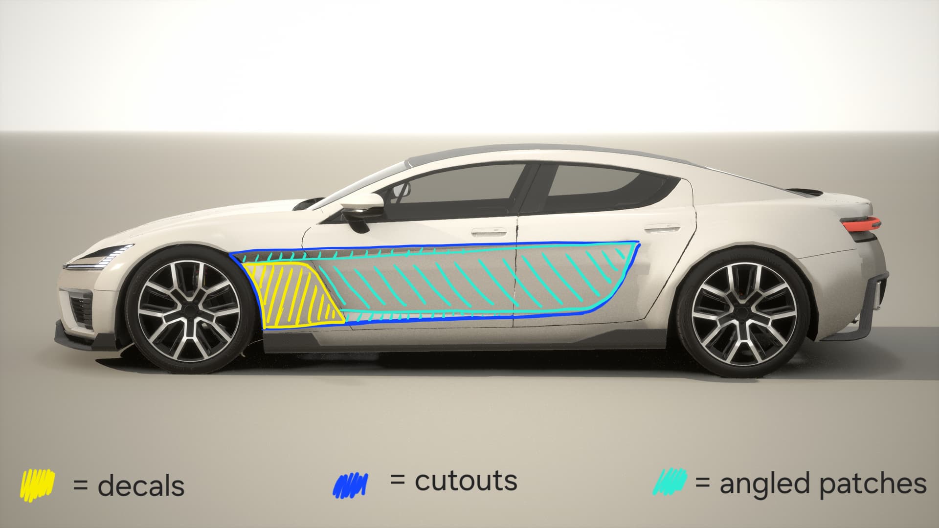 Step 3 (optional) is to add the diagonal shape next to the front wheels. I used decals for that, shown in yellow.