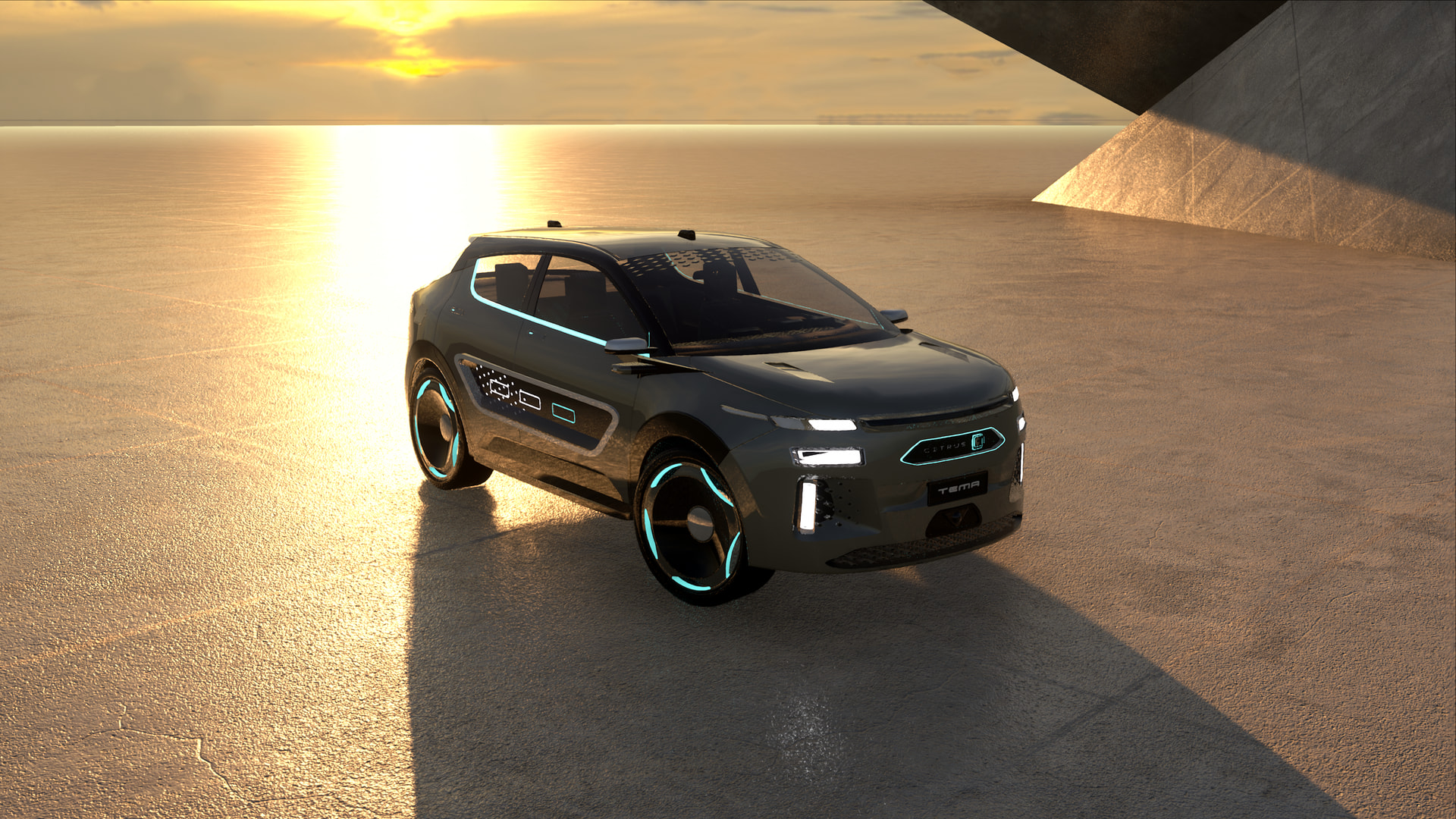 Featuring references of Citrus’ past, the bold and simple, yet distinctive lines of the LUMIERE spell out its future. The front and rear fascia features one bold line of light going from side to side, with three diagonal lines running down asymmetrically, as seen on older models as grilles. Particle bits line the grille and serve as accents, increasing presence and elegance.