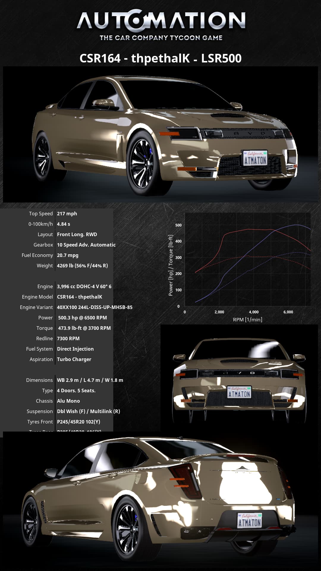 The Apex LSR500 SE redefines luxury and performance in a full-size sedan. Under the hood lies the Precision Engineering & Machining 40XX100, a 4.0-liter twinForce V6 delivering a heart-pounding 500.3 horsepower and 473.9 lb-ft of torque. Coupled with a 10-speed advanced automatic transmission and the TorqDrive RWD system, the LSR500 effortlessly achieves a top speed of 217 mph and rockets from 0 to 100 km/h in just 4.84 seconds. Precision engineering ensures thrilling acceleration, controlled cornering, and the ultimate in driving exhilaration.