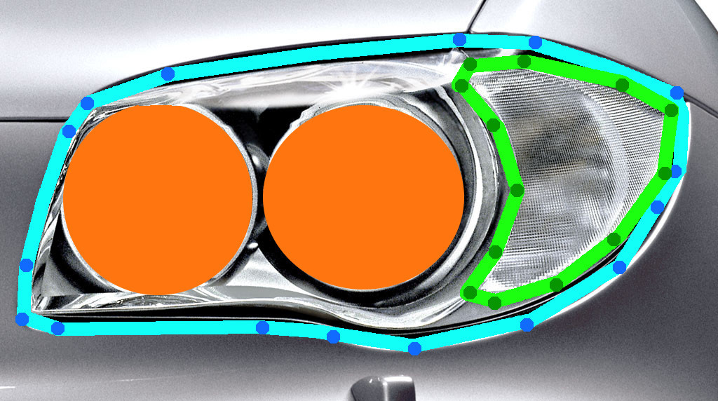 In blue is the silhouette. This is the headlight’s shape, as described previously, and can be edited by moving the darker dots’ positions. These are the “edges.”