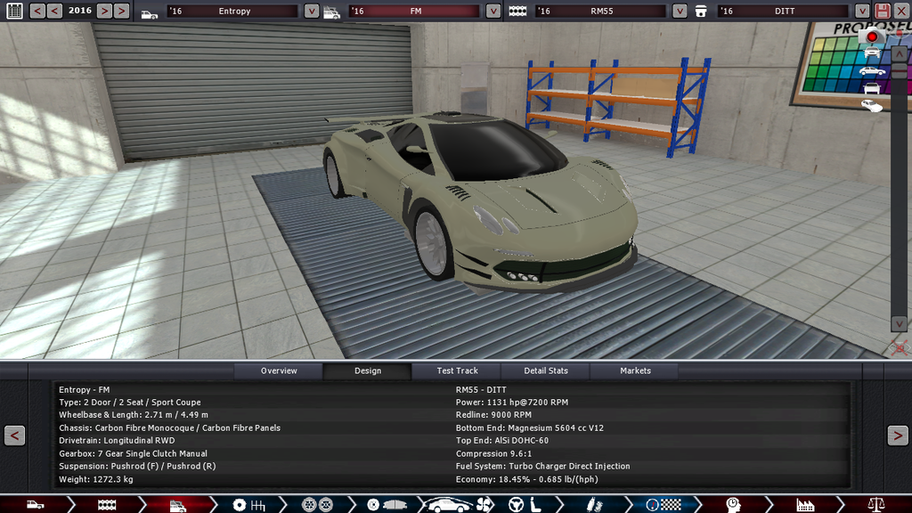 Yanked out of a 90s GT1 project that never got anywhere and previously tried on the Zentorno (ye styling is 100% inspired by that thing so IDK what else to call it) concept (which was considered for the 2017 Hypercar shootout but it ended up too heavy and expensive, I’ll show you guys anyway soon.) the RM55DITT is a 60 valve 5.5 liter DOHC twin turbocharged V12, made out of two HA28EI V6 motors used in sedans back in the 90s welded together and retrofitted with direct injection and magnesium construction. Running on 100 octane fuel (though the ECU can adjust itself to run on lower quality fuels on the fly, not that it matters too much, I only used 100 octane for economy concerns), it produces 1131 horsepower at 7200 RPM and around 1400 NM of torque at 4000 RPM and a redline of 9000 RPM driving the rear wheels with a slightly upgraded 7 speed manual box found in the Izanami.