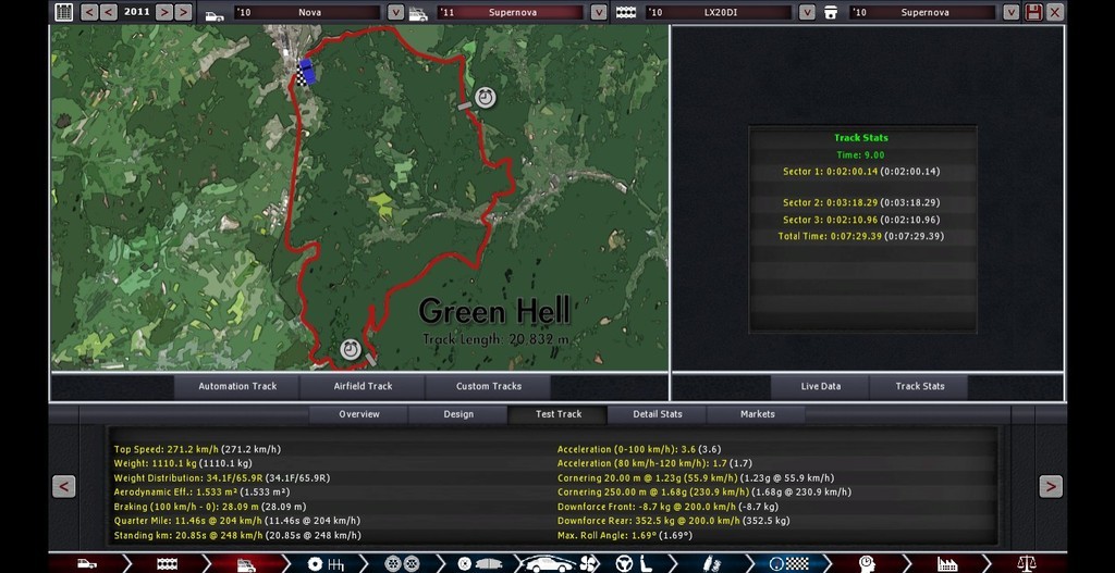 Mine has 1000hp flat and uses carbon-carbon chassis so is much lighter, therefore doesn’t need such high cornering at high speeds to get sub 7 minute times (playing with the notion of using a 6 speed H pattern manual box but I suspect it would be not very streetable LOL). I also note that despite use of active wing you’ve pretty much maxxed out the downforce anyway, which would explain the top speed of 347km/h (I’ve set mine such that the active wing does all the work, top speed is therefore about 424km/h). What tech slider have you set your tyres to? The 0-100 time is very good.