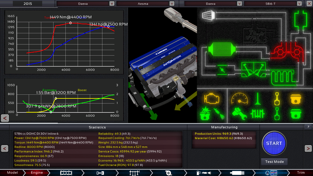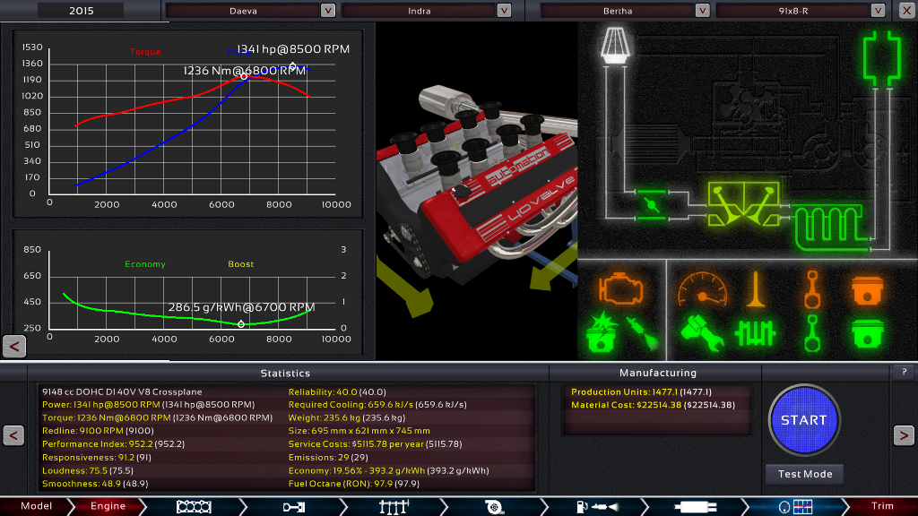 For this challenge, I was to try and max out the performance of the car, but in order for Žnoprešk to consider it for production, Drivability had to remain at least 50, Comfort at least 30, and total costs could not exceed 22500 units. Given my interpretation of how cars test (which may change, I dunno how BROBOT will affect the simulation), a properly fast supercar would require a time of less than 7:07, which is to say in the least a challenge. In addition, I committed to leaving the chassis completely unchanged, and the materials of each component also unchanged.