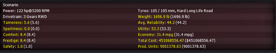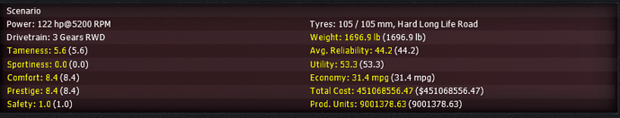 Doing the above, but with all driver assists removed does not cause a crash. The gearbox stays as a manual double clutch gearbox with 9 speeds, and leaves a techpool of -185. The rest of the car gets changed appropriately and, as you would expect, the price has gone into silly figures