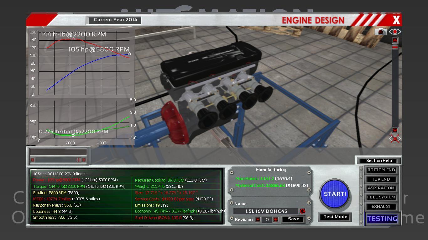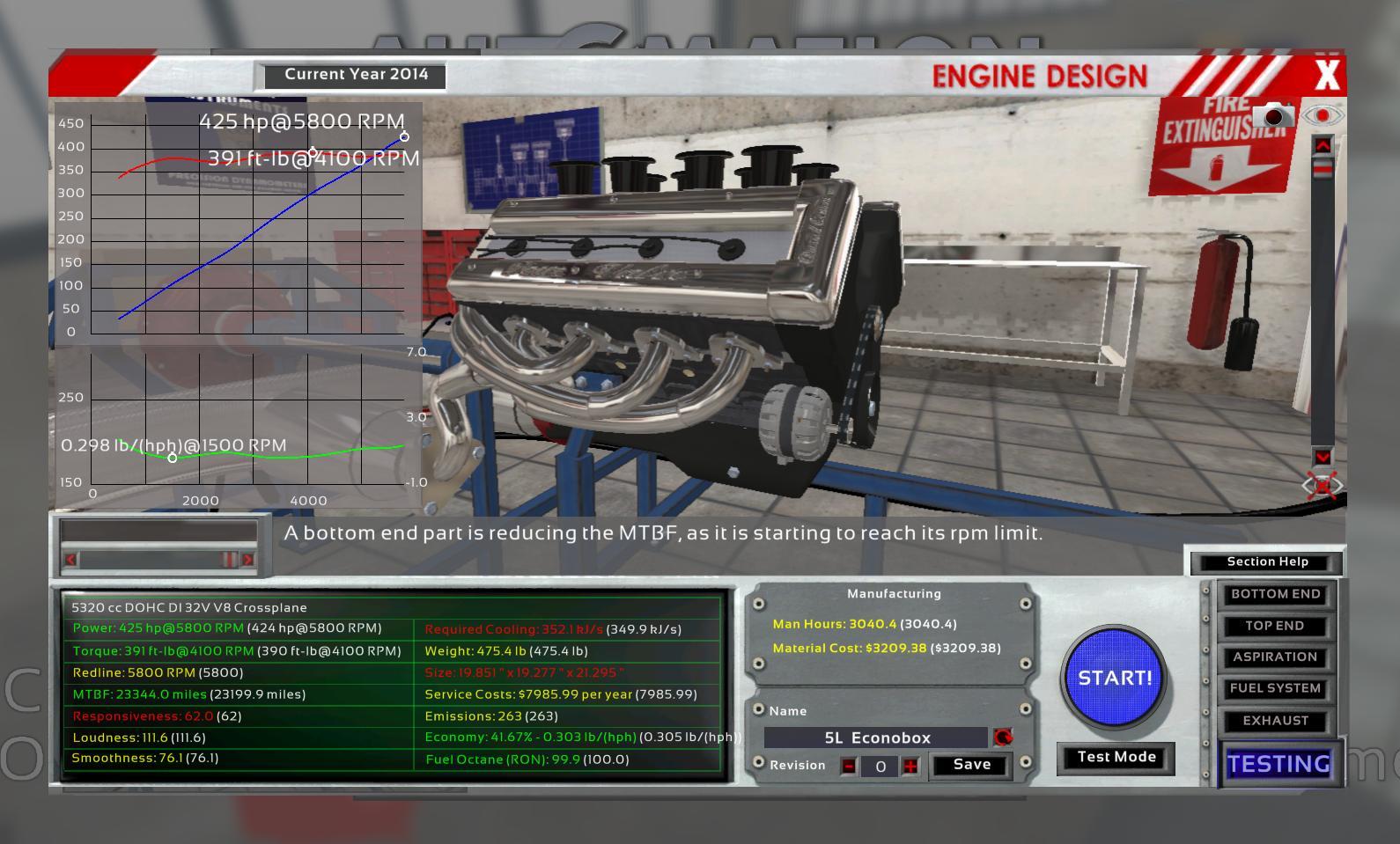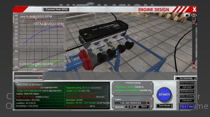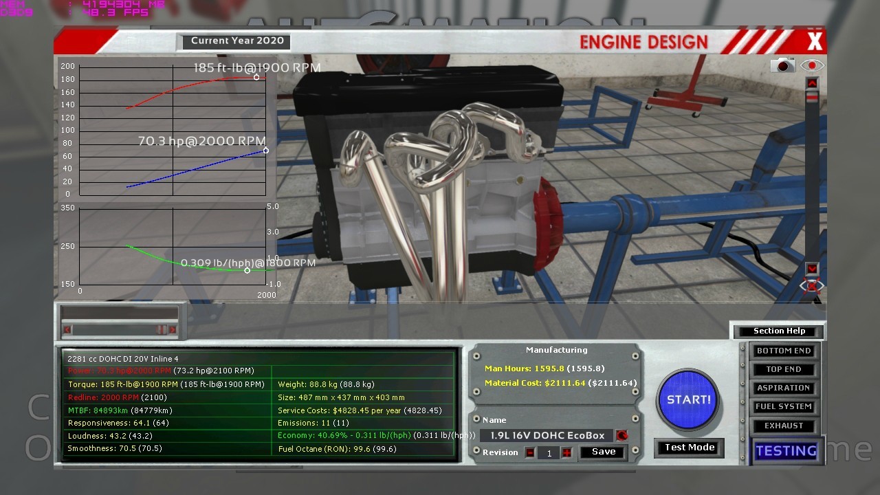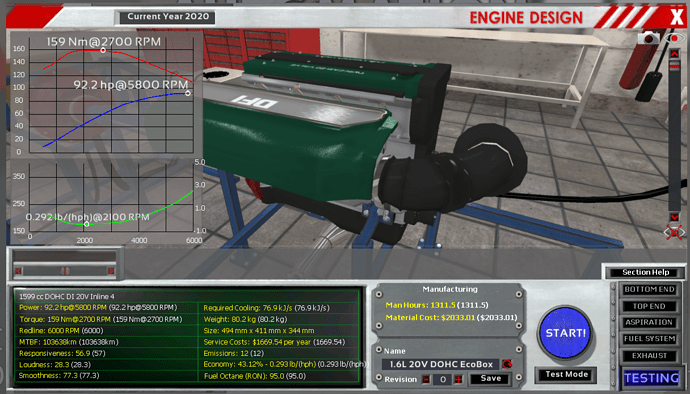 I had an old I4 that I made for economy back when I only had the demo. A few tweaks later and it comes out at 40.69% (0.311lb/hph), although its now its only use would be as an oversized, underpowered generator because some of the modifications that gave a slight economy increase made it drastically worse in other areas. As a 1.9L 120bhp engine (with a rediculous build time) it was at 40.20%