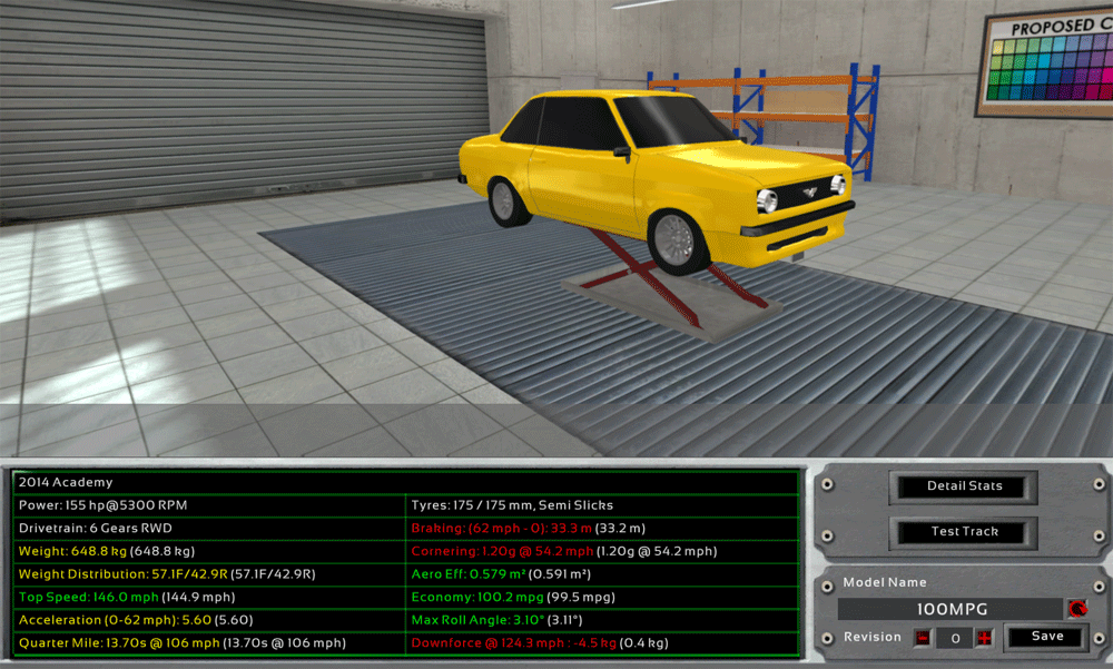 edit: Just gave it a few revisions; changed the tyres to 165/165 Hard Long Life, gave it a slightly revised seven speed gear box, with it now reading 104.1 MPG. When diesel makes its way in, the VW XL1 will have a competitor.